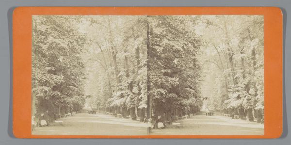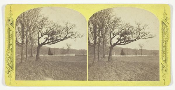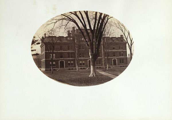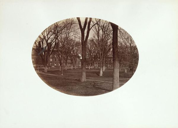Curator: This is "The Delta," a photograph by George Kendall Warren. It depicts the intersection of Kirkland and Cambridge Streets, featuring the Jared Sparks House. Editor: The stark trees and the muted tones create an almost melancholic mood. The oval vignette really isolates the scene. Curator: Exactly. Note the way the bare trees frame the house in the background, drawing the eye toward the central structure, creating depth and hierarchy. Editor: And consider the labor involved. Photographing this landscape required a significant investment in equipment and materials, reflecting the social status of both the photographer and the subject. Curator: The tonal range is exquisite. The use of light and shadow emphasizes the geometry of the branches and architecture. Editor: Agreed. Understanding the economic and social conditions surrounding its creation is key to a full appreciation. The photograph itself is a commodity, reflecting certain class values. Curator: Thinking about the formal elements, the composition invites contemplation on the relationship between nature and human construction. Editor: Ultimately, by considering the materials and the historical context, we gain a deeper understanding of the work’s value.