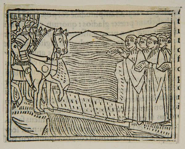 Editor: This is an anonymous woodcut titled *Book XXVII.51. Hasdrubal defeated by Marcus Livius and Cladius Nero; his head is thrown before African prisoners*. The scene is stark, with that severed head so prominently displayed. What strikes you about the politics of imagery here? Curator: Well, this image visualizes power dynamics and conquest. The act of displaying Hasdrubal's head isn't just about victory; it's a calculated spectacle. How does the artist use composition to emphasize the power imbalance? Editor: The positioning of the head between the prisoners and the victorious soldiers creates a striking visual separation, amplifying the victors' dominance. It's a public declaration of power. Curator: Exactly. These images, part of larger historical texts, reinforced narratives of Roman supremacy and justified colonial expansion. It makes you consider the role of art in shaping public perception of power, doesn't it? Editor: It certainly does. I hadn't considered the propagandistic function so explicitly. Curator: Art often plays a role in the theatre of power.