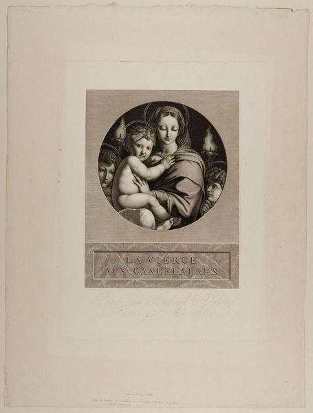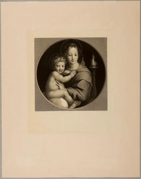 Curator: Up next we have "The Holy Virgin" by Jean Charles Flipart. Editor: It’s serene, almost melancholic. The Madonna seems burdened, despite holding the child. Curator: This print is based on a painting by Raphael, and it reflects the visual culture of 18th-century France, where images of the Madonna were common in both religious and secular settings. Flipart was known for his reproductive engravings. Editor: It makes you wonder about the role of the Madonna in that society—a symbol of purity but also perhaps of the constraints placed on women. What expectations did this image impose, and for whom? Curator: Exactly, prints like these circulated widely. They shaped and reinforced societal norms. Editor: It's a delicate balance: the artistry versus the messaging it carries. What does it mean to revisit such imagery today? Curator: Revisiting is vital. It allows us to unpack the historical context, dissect the power dynamics, and understand the lasting impact of these representations. Editor: Indeed. It's more than just a pretty picture; it's a window into a complex past.