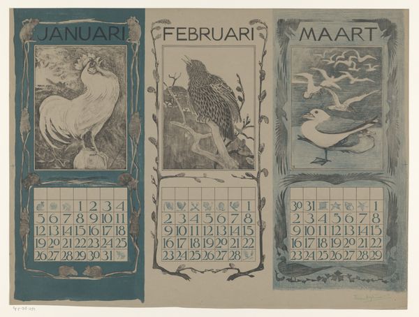 This print, whose artist we don’t know, is a color lithograph calendar in three parts, likely made around 1900. Note the choice of process: lithography was a favored printing technique for commercial art due to its relative speed and low cost. The way that color has been applied here – flat, graphic, without tonal variation – speaks to the influence of Japanese prints, which were all the rage at the time. As for the imagery, we have three groupings of birds and calendars that show August, November and December. The zoological theme is echoed in the stylized depictions of monkeys, cats, and other fauna. We don't know exactly who this calendar was made for, but the artist seems interested in making the natural world orderly, knowable, even available for purchase. This print asks us to consider how humans classify and consume nature, turning it into a series of monthly grids.