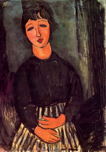 Curator: The elongated features immediately give this portrait a melancholic aura, wouldn't you agree? Editor: Yes, the way her neck stretches upward evokes a sense of longing, of reaching for something just beyond her grasp. Shall we delve into who we see depicted here? Curator: Of course. This is Amedeo Modigliani's "Portrait of Lunia Czechowska in white blouse", rendered in 1917 with oil on canvas. It belongs to a private collection. I am struck by the stylization he employs; the face almost becomes a mask, enigmatic and serene. It evokes certain archaic Greek sculptures. Editor: Modigliani's choice to leave her eyes blank certainly contributes to the mysterious effect. It makes one consider how women were often rendered voiceless, as objects of male desire, which echoes how this was painted during a crucial juncture of women's rights movements. How does Lunia, then, negotiate such representation? Curator: Perhaps in her simplicity. Look at her blouse, almost monastic. It's as though she internalizes the gaze, becoming her own symbol rather than an object defined solely by external perception. What do you think? Editor: I think the ambiguity works. We could read this portrait as passive, or equally as a subtle act of resistance. Even that single, understated brooch speaks volumes—a quiet assertion of identity in a world that might seek to erase it. Curator: Beautifully said. And the muted palette certainly contributes to the painting's introverted mood. Those grays and browns frame a moment suspended in time. Editor: Absolutely. The way Modigliani balances abstraction and figuration is just striking. There's a profound humanity there, struggling to be seen. It reveals more than the conventional mode of portraiture where wealth and affluence dominate the picture. Curator: It leaves us to imagine her inner world. What did she believe in, desire, fear? These are not depicted through superficial details, but suggested through subtle forms. Editor: Exactly. Art has the power to resist fixed narratives, which is what is so fascinating about this particular painting, as we come face-to-face with such an exquisite depiction. It’s the lack of narrative that tells its own story, in its way. Curator: This glimpse we had offered today speaks of lasting dialogues across time, of representation, agency, and interpretation, and how artworks carry a wealth of meaning, always awaiting to be unpacked.