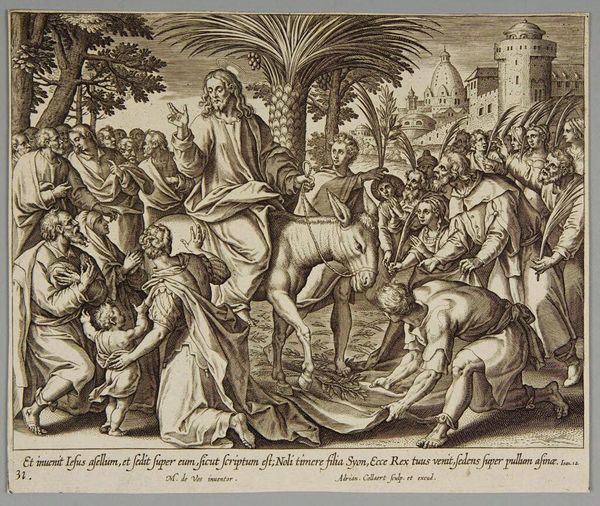 Editor: This is Johanna Sibylla Kraus's "Scene Eight" from the Harvard Art Museums. I'm struck by the dynamic composition; it feels very active. What do you see in the way the artist utilizes line and space? Curator: Indeed. Note the density of lines that define form and create tonal variation. How does the artist employ hatching and cross-hatching to articulate depth and volume within the scene? Editor: I see a lot of clustered lines creating dark areas, but there are also areas with very few lines making it seem brighter. Curator: Precisely. Consider how the strategic placement of these lines contributes to the overall rhythm and balance of the composition, directing the viewer's eye through the narrative. I find the lines very engaging. Editor: It's amazing how much detail is conveyed with just lines. I have a newfound appreciation for etching! Curator: Agreed. This piece shows that formal elements communicate just as vividly as historical ones.