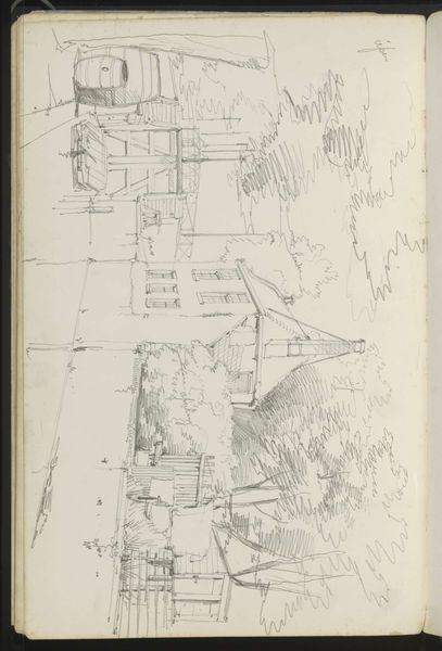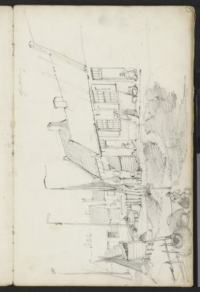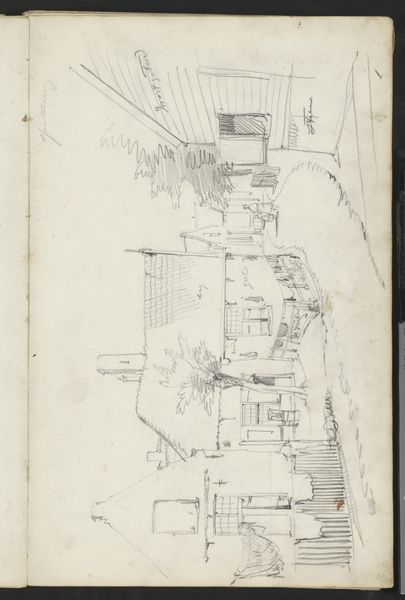 Curator: Take a look at this work titled "Boerenwoningen," or "Farm Houses," created by Willem Koekkoek around 1888. It's currently held in the Rijksmuseum collection. What are your initial impressions? Editor: The energy is palpable. It looks like a quick sketch done on the fly with pen and ink, raw and immediate. I’m drawn to the materiality of the lines themselves—so sparse, but they build a very specific sense of place. Curator: Absolutely. And those lines, although quickly rendered, describe a world steeped in history and tradition. Notice the steep thatched roofs, almost drooping with age. They evoke a sense of rootedness, don’t they? We associate such forms with images of steadfast communities. Editor: Rootedness yes, but what about the tools required? What type of paper and ink enabled him to capture such granular details quickly? The act of physically drawing these lines by hand suggests not only the availability of these resources, but their intended function. It shows a purposeful act of observing, consuming, and translating the surrounding social landscape. Curator: Good point! But also consider this from a symbolic perspective. Farmhouses, in Dutch art and culture, frequently appear to signify not just shelter, but also notions of simplicity, hard labor, and an almost biblical connection to the land. They stand as monuments of human resilience. Editor: But what does resilience actually look like? Notice the marks and striations, all likely the byproduct of the ink-making and drying processes. What are these houses *actually* made of? How does the physical labor impact their value as something "real" versus Koekkoek's rendition? Curator: The material speaks to the societal, I get it. Even in this sketch format, these dwellings connect us back to specific architectural styles characteristic of rural Holland at the time. These types of dwellings represent both practical living spaces and emblems of Dutch identity. Editor: I see them more as representations of resources-- where the ink and paper become symbols for accessibility and widespread distribution of certain mediums during this period. It highlights their everyday-ness as a product and their social-economic impact, even for sketching! Curator: I see your point, and yet I can't help but view those roofs as echoing a certain collective aspiration for permanence. An ideal of home, so to speak, regardless of its accessibility or creation. It touches upon something fundamentally human. Editor: Well, either way, analyzing its place in the canon forces me to be mindful about my consumption of history and our shared cultural heritage through art.