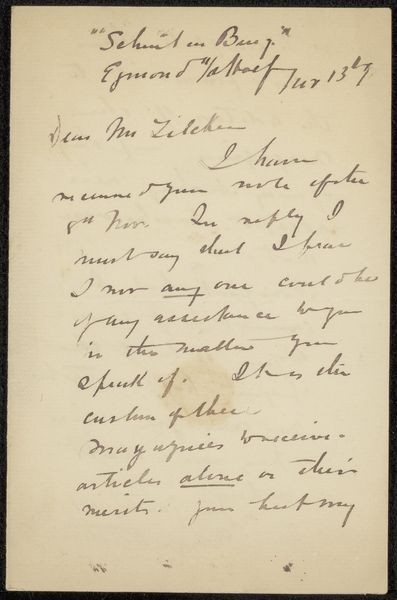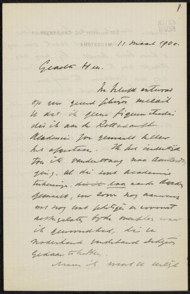 Editor: This is "Brief aan Philip Zilcken" a letter made with pen and ink on paper, created sometime between 1900 and 1911 by Tony Lodewijk George Offermans. There’s something very intimate and personal about seeing someone's handwriting, a glimpse into their thoughts and life... What story do you think this letter is telling us, Curator? Curator: Oh, I adore this! It’s like stumbling upon a forgotten whisper. To me, it speaks of artistic communities, that old "Pulchri Studio" letterhead promising connection and creative refuge in The Hague. And then, that delicate script… imagine Offermans, pen in hand, crafting a world with his words! What secrets might that ink hold? Look at the way the words lean into each other, almost dancing across the page. Does it remind you of a secret, told softly between friends? Editor: Definitely a friendly and intimate secret. The reference to “Annie” certainly adds to that feeling of familiarity and intimacy. Given the date, could this letter reveal something about artistic life at the beginning of the 20th century? Curator: Precisely! It's a window into a bygone era – think artists debating aesthetics over coffee, plotting exhibitions, maybe even sharing gossip about the Queen Mother! Consider also the “telephone number” printed – technology’s intrusion, even then. Each looping letter holds echoes of debates, dreams, disappointments… it is delicious. Don't you find yourself wondering who Annie was and what urgent news prompted this letter? Editor: Absolutely. It makes you wonder about the human stories behind the art. The texture of everyday life becomes tangible through such a small artefact. Thanks so much, Curator. This has really given me a different perspective on looking at letters. Curator: My pleasure. And remember, the real art lies not just in *seeing*, but in *feeling* the echo of a past life within it.