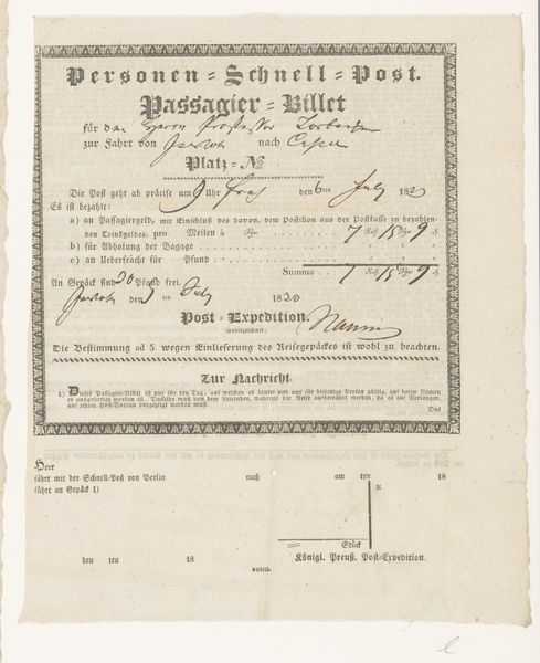 This anonymous reisdocument, or travel document, from 1832, offers a glimpse into the social dynamics of 19th-century travel in Germany. Printed with ornate lettering, this “Schnellpost Cours” or express mail coach, details a journey from Elberfeld to Iserlohn. It lists payment for passenger fare, including tips for the postman to be paid from the post office, baggage fees and freight per pound. The document also notes that 30 pounds of luggage are free. We can only imagine the negotiations, or the class distinctions inherent in such transactions. What does it mean to have your name attached to a journey, to have it recorded and accounted for? What does it mean not to be named? This reisdocument is a poignant reminder of how travel, then as now, was shaped by economic status, underscoring the complex relationship between mobility, identity, and power.