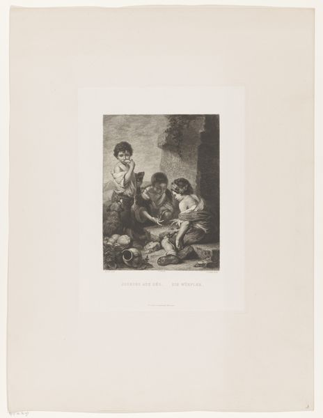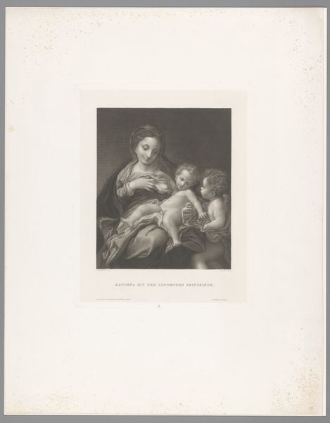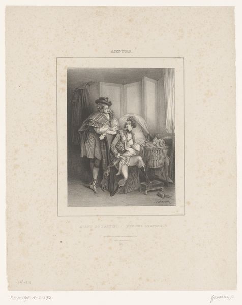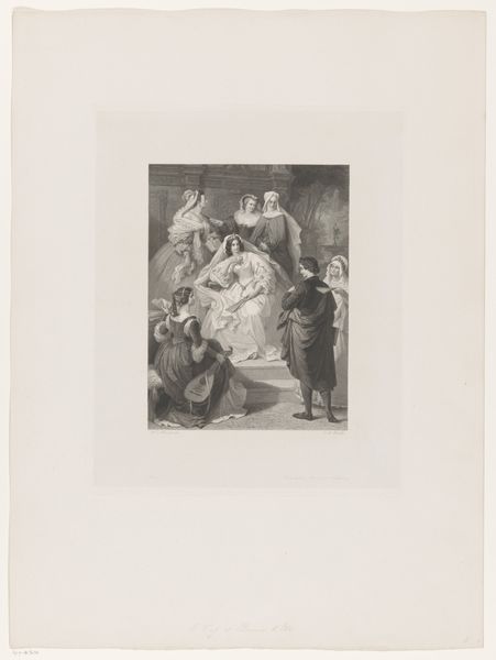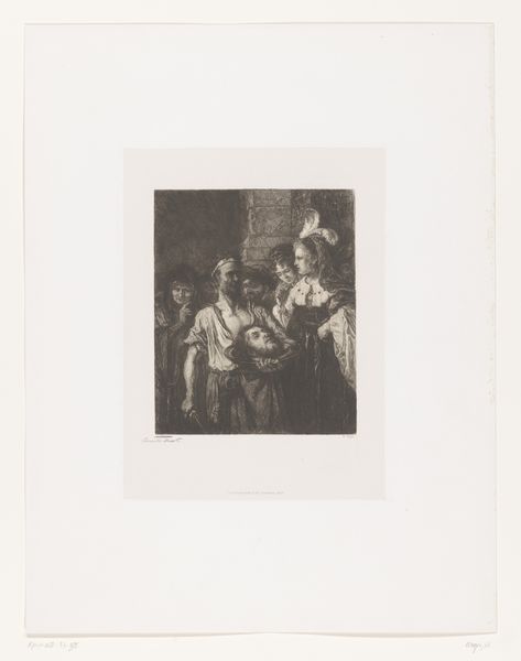 Curator: Here we have Cyprien Charles Marie Nicolas Gaulon's "Caricature of an Old Woman in Front of the Mirror," created in 1824. The work provides an interesting perspective, both literally and figuratively, on societal expectations and aging. Editor: Woah, what a mood! It's making me feel all sorts of complicated things. Is it satire? Tragedy? Maybe both with a dash of darkness... it feels so unsettling. Curator: The drawing exemplifies elements of Romanticism, which often explored heightened emotion and the grotesque. It critiques vanity through caricature, a lens through which we might analyze constructions of beauty and power at that time. Editor: So, what do you see happening in the piece? She is staring at a mirror; an almost ghoulish face peers out at her! What’s with the other people around the mirror—all laughing and whispering like mean children? Curator: Yes! I'm seeing a collision of realities, with this elderly woman grappling with her reflection and public perception. Think about the gaze operating here, the pressures imposed particularly on women, as she tries to adorn herself while being watched and mocked. Editor: Exactly. You're making me see it. It is like those fashion magazines where everyone is young and gorgeous, versus that sinking feeling when looking in the mirror…that is the story that the painting shares. Curator: It pushes beyond just individual concerns of aging and gets at those patriarchal systems upholding these constraints. Editor: Art offers a space to consider uncomfortable truths, and there is a timeless message here, wrapped in 19th century humor. This caricature is both brutal and beautiful; and the artist created an enduring narrative about self-image and societal pressures that resonates today. Curator: Absolutely. Gaulon presents not just a comedic scene, but rather, an introspective study of aging, gender, and judgment. The history painting that emerges goes beyond a mere physical likeness; instead, we consider its potential to explore individual and collective identities.