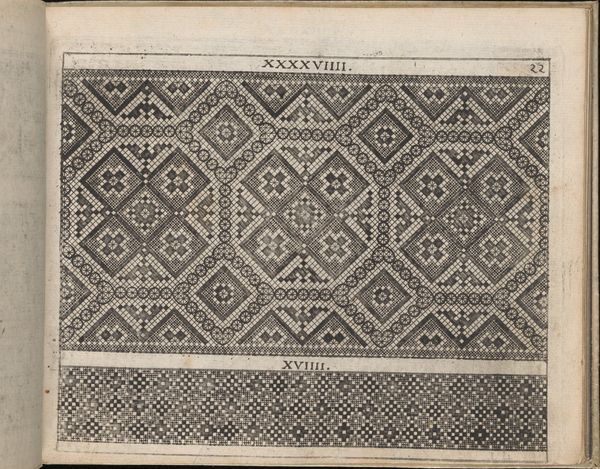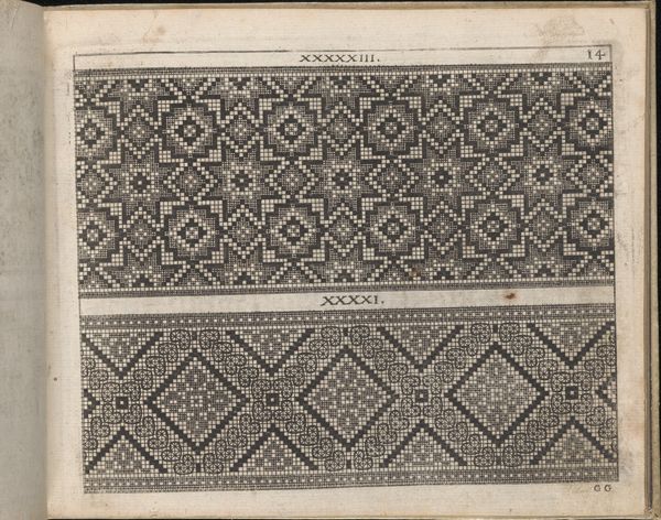 Editor: So, here we have Giovanni Ostaus's engraving from 1567, "La Vera Perfettione del Disegno di varie sorti di recami." It's a page from a book, showcasing different embroidery patterns. They look almost like pixelated mosaics. What stands out to you? Curator: Immediately, I see the persistence of memory encoded in geometric forms. Look at the Greek key motif at the very top. This symbol, once laden with significance in ancient Greece, signifying eternity and interconnectedness, reappears here centuries later, transformed into a design element for embroidery. What cultural echoes do you hear in it? Editor: That’s a great observation! I hadn’t considered its deeper roots, just the aesthetic value. Curator: Precisely. And note how Ostaus, likely drawing on earlier traditions, presents these designs not merely as decoration, but as a ‘perfettione’ – a true perfection. The designs connect forward to us and backward to previous times. Do you see that kind of through line happening? Editor: I guess so. These designs probably ended up influencing textile art for centuries. Curator: Indeed. Visual motifs operate this way, acting as conduits across time, retaining remnants of their past meanings. What psychological effect do you think the repetition of such patterns might have had on those creating and viewing them? Editor: Hmm, maybe a sense of order and continuity, reassuring in a world of change? Curator: Exactly! There's a grounding, almost meditative quality to repetition. These patterns were not just decorative; they were mnemonic devices, carrying cultural knowledge. The practice of needlework connects these women to earlier female artisan traditions and that collective unconsciousness shows in these designs. Editor: I’m seeing this piece in a whole new light now, thank you. Curator: My pleasure. These are historical lessons encoded through visual devices, to create meaning and memories.