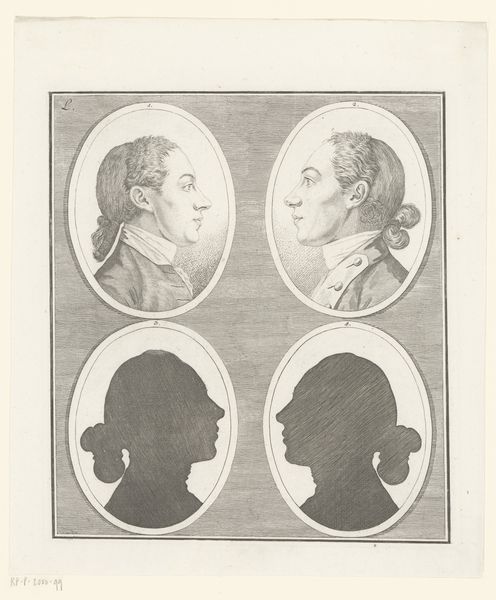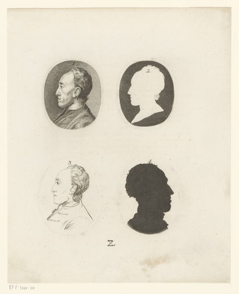 This anonymous print presents two men's heads, one a detailed portrait and the other a silhouette, both framed by ovals. The silhouette, or shadow portrait, has ancient roots. Pliny the Elder tells of its origin in ancient Greece, when a maiden traced her lover's shadow before his departure. The act of tracing a shadow transforms the individual into a symbol, a dark echo. Shadow portraits capture not just likeness but something more profound. It is almost as if the shadow, stripped of detail, hints at the hidden, subconscious self. Consider how this simple profile echoes across time, reappearing in diverse forms. From ancient coins to modern graphic design, the profile distills identity to its most essential form. The silhouette, devoid of color and texture, speaks to the primal human fascination with light, shadow, and the very essence of identity. It’s a cyclical journey, this dance of image and symbol.