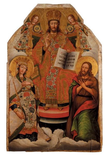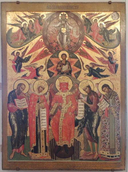 Curator: This tempera painting, known as "Holy Wisdom," dates back to 1850 and represents a fascinating example of Byzantine-influenced Orthodox iconography. Editor: Wow. There’s a kind of serene, floating quality about it, isn’t there? Despite the fairly rigid poses, the figures almost seem weightless, adrift in this golden, celestial space. And so much red! Curator: The hierarchical composition is quite typical. We see the Theotokos, or Mother of God, and John the Baptist flanking the central figure of Holy Wisdom enthroned. Above them, Christ Emmanuel is depicted with angels surrounding. Editor: The layering is pretty intense—nested halos, celestial figures above… it gives a sense of the divine as being almost structurally organized, like a celestial bureaucracy. I imagine that structure has political implications. Curator: Indeed. Consider the social function of such imagery. These icons served not just as devotional aids but also reinforced a specific cosmology and, by extension, the earthly authorities legitimized through their connection to the divine order. Editor: That’s pretty powerful when you consider how illiterate most people would’ve been back then. Visual stories like this became their reality. Curator: The use of tempera also impacts our reading. That medium often leads to flattened perspectives and intense, symbolic color choices. Editor: I was going to say! Those sharp lines and flat planes of color contribute to the overall otherworldly effect, a feeling that it isn’t bound by earthly physics, yet intensely visceral nonetheless. Curator: Exactly. These weren't meant to depict the everyday. Their intent was to evoke higher truths, and encourage the observer to see beyond the present. Editor: In some ways, despite the obvious historical distance, icons such as this can offer an arresting reminder of the power that images still wield in shaping collective belief. Curator: It allows a connection between worlds. Editor: True. I find it impressive how this one continues to draw me into its peculiar beauty despite such significant differences in beliefs or knowledge.