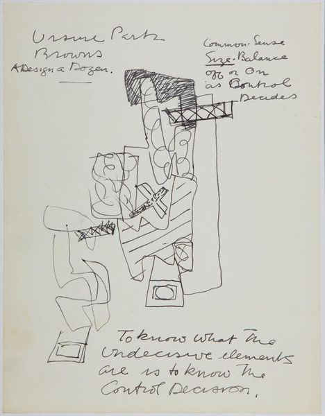 Editor: This is "Art Theory Text with Sketch" by Stuart Davis. It's just a simple ink drawing, almost like a doodle, but there's also a block of text. What do you see in this piece? Curator: It looks like an attempt to distill complex ideas into simple forms. The abstract sketch evokes modern machinery or architecture, while the text hints at Davis’s artistic philosophy. Do you see any symbols that stand out? Editor: The circles with crosses inside? I'm not really sure what they could mean. Curator: Consider how they might represent something mechanical, or perhaps even celestial. Davis often incorporated familiar symbols to build layers of meaning. It reminds us that even seemingly simple shapes can be loaded with cultural memory. Editor: That makes me see it in a whole new light. Thanks!