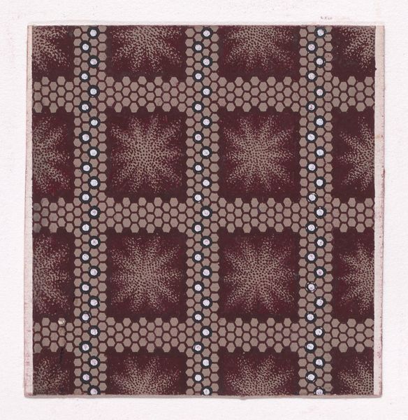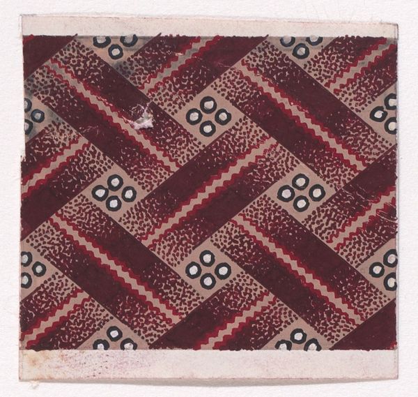 Curator: Here we have a textile design dating back to around 1840. Its full title is “Textile Design with Basketweave Pattern Background, Small Rosettes Flanked by Two Leaves and Pearls” and it is held at the Metropolitan Museum of Art. It’s anonymous, which tells its own story, doesn't it? Editor: Absolutely. My first impression is how comforting this pattern feels, with its deep reds and earthy tones. The way the elements repeat and interlock creates a sense of unity. Do you find it pleasing as well, or does it lack excitement for you? Curator: I appreciate the formal qualities. The diagonal arrangement provides movement against the static repetition of the motifs. Look at how the artist alternates blocks—one textured, one smooth—it’s an interplay of surface and depth, pushing and pulling the viewer's eye. Editor: It makes you think about domestic interiors, doesn’t it? About who would have lived with fabrics designed like this and under what social circumstances they were produced. Curator: Precisely! I wonder about its societal role during that time. It evokes themes around bourgeois aspiration during the Industrial Revolution. The symmetry perhaps mirrors a desire for control during the disruptions of industrialization? Editor: The "anonymous" aspect speaks volumes, too. This kind of textile production often involved the exploitation of women, children laboring in mills. The beauty obscures a complex economic and social reality. Curator: I see that reading of oppression in production and market hierarchies but, perhaps, this could be a sample from design books meant to inspire and guide, rather than an artifact of actual textile creation? It would imply the possibility of amateur and home craftsmanship too! Editor: It highlights how our perceptions of art are so intertwined with its material and labor conditions. Appreciating its patterns is not just about what's pleasing to the eye, but about who made it and how they lived. Curator: Indeed. It also reflects on current art with its themes, showing how relevant even the designs are to culture's development as it moves forward. Editor: It adds another layer to our understanding. Let’s not forget to also look at the patterns, shapes and production models, after all they matter equally in order to completely describe an artwork!