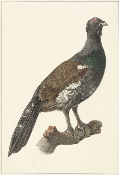 Editor: Here we have Mark Catesby's "The Swallow Tail Hawk," likely from 1754, rendered in watercolor and colored pencil. It's striking how the hawk fills the frame, almost confronting the viewer. What stands out to you when you look at this? Curator: Immediately, I see the representation of power coupled with vulnerability. Birds, historically, often represent freedom and aspiration. Hawks, in particular, signify strength and keen vision, but this one is perched, still. Note also how its eye is presented. The orange/red coloration could relate to anger or violence, while its relative small size gives the impression of timidity. The "swallow tail" is particularly striking, since it alludes to migration and adaptation. How do you interpret that tension between the hawk’s inherent predatory nature and this static portrayal? Editor: That's fascinating. I hadn’t considered the implied tension. It does feel almost frozen, caught mid-thought. Perhaps it suggests a moment of reflection, a pause before action? Curator: Precisely! Think about what Catesby, as a naturalist documenting the New World, was trying to capture. Was it merely the bird’s physical likeness? Or something more profound about the relationship between humanity and the natural world, perhaps evoking both awe and the potential for disruption? Does the focused detail signal the bird's importance? Editor: It does feel symbolic now that you mention it, like he wanted the viewer to really study it and consider its place in the world. Curator: Think about what the hawk is *not* doing - it's not soaring or hunting. It *is* perched with watchful eyes. Its visual power signifies to a viewer that continuity of nature and attention to symbols are vital. How does contemplating these details change your initial impression of the artwork? Editor: It’s given me a deeper appreciation for the layers of meaning that can be embedded in what seems like a straightforward depiction of nature. Thanks so much. Curator: A pleasure. Now, whenever you see an image of a bird, consider what its symbolic association might be.