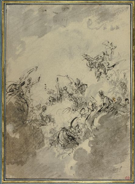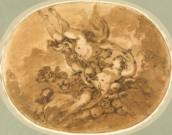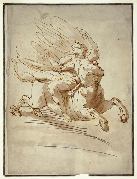 Editor: This is an intriguing drawing, Boreas and Oreithyia, dating from an unknown period. It is done in ink, graphite, and chalk on paper. It looks rather like a preliminary sketch with all the visible construction lines. What can you tell me about this work? Curator: Ah, yes, a captivating abduction! Look at Boreas, the north wind, scooping up Oreithyia. It’s like a weather report with a heavy dose of Greek myth drama! It is the moment when raw force meets – well, unwilling desire! What strikes you most about their poses? Editor: Well, he's certainly got her. She seems less than thrilled! The landscape elements in the background seem less defined than the figures. How does that play into the story? Curator: The indistinct background heightens the drama! Consider how it might suggest the uncontrollable nature of Boreas himself, a force of nature. The way the artist uses chalk softens the edges, don't you think, giving a sort of ephemeral, dreamlike quality to what is, essentially, a violent act. It makes it almost...romantic. Editor: Romantic, huh? That’s a bit of a stretch, maybe. The myth itself is pretty brutal. So, how does this “romanticism” change our reading of that violence? Curator: Perhaps it encourages us to see the story not just as a kidnapping, but also as a moment of intense, albeit forceful, transformation. The softer lines could suggest vulnerability, even in the god of the North Wind. Does it redeem the action? Absolutely not. But it does add layers of complexity. The best art makes us ask those difficult questions! Editor: It's unsettling, seeing this mythological story depicted with such ambiguity. I hadn’t really considered that aspect of Romanticism before, the appeal to emotional intensity even in difficult subjects. Curator: Exactly! Now you're catching the wind, so to speak. It makes me think of all the myths, are they stories of romance, violence or power? This sketch is not just beautiful to view, it gives pause to thought.