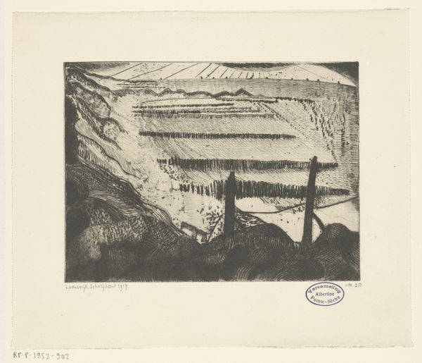 Antoon Derkinderen's etching, "Boerenschuur met kar," invites us into a space defined by stark contrasts and textured surfaces. The artwork employs a monochromatic palette to evoke a somber mood. The eye is immediately drawn to the interplay between light and shadow, which carves out depth and volume within the scene. Derkinderen uses the etching technique to create a rich tapestry of lines and tones, giving texture to the architecture. The structural elements such as the beams, walls and doors are composed in such a way that they create a semiotic system of signs which decode a deeper meaning. The positioning of the cart, shrouded in shadow, creates a certain disruption which challenges the meaning that lies within. The distribution of light and darkness functions not just aesthetically but as part of a larger cultural and philosophical discourse, inviting ongoing interpretation.