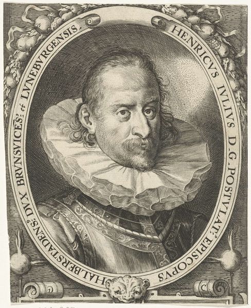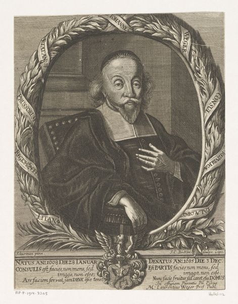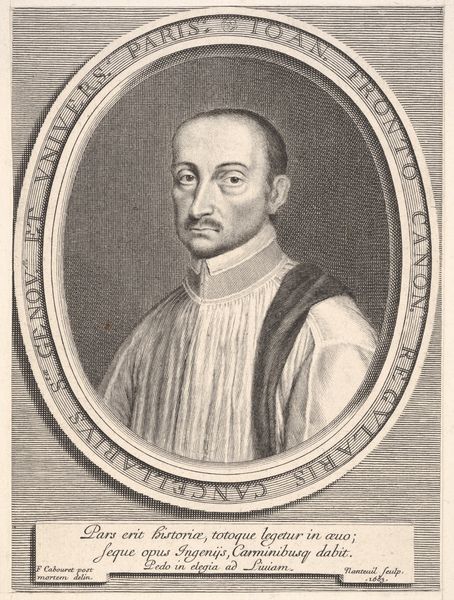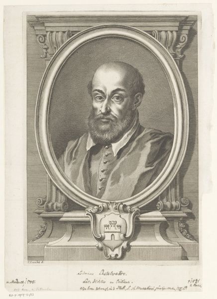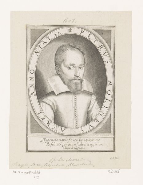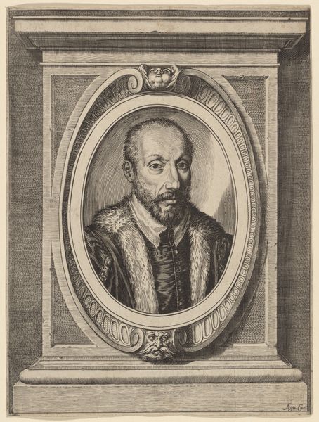 Thomas de Leu made this portrait of Pierre de Brach at an unknown date using engraving techniques. It captures the likeness of Pierre de Brach, a prominent figure of his time. The portrait, set within an oval frame, offers a glimpse into the world of 16th-century male identity and status. De Brach, depicted holding a book, embodies the era's emphasis on learning and intellectualism, yet his formal attire reminds us of the rigid social structures of the time. The gaze, both direct and slightly aloof, is an interesting mix of self-assurance and detached observation. As we consider this image, it's important to reflect on the historical context in which it was created. What did it mean to be a man of letters in 16th-century Europe, and how did portraits like this one serve to reinforce social hierarchies and power dynamics? This image challenges us to question whose stories are told and preserved through art, and whose are left out.