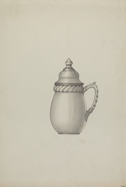 Editor: This is Hester Duany's "Silver Mustard Pot," created around 1939, a pencil drawing that feels almost photographic in its detail. It seems to elevate this everyday object to something precious. What jumps out at you when you look at it? Curator: Considering its creation date, around 1939, it’s important to remember the looming shadow of World War II and the Depression’s lingering effects. Rendering a luxury item like a silver mustard pot with such care might be seen as a form of escapism, or perhaps even a quiet assertion of enduring value in a time of uncertainty. Do you think this kind of realism would appeal to audiences facing such stark economic challenges? Editor: That’s a perspective I hadn’t considered. It feels almost like a defiant act of beauty in a period of struggle. The level of detail seems to demand attention. Curator: Precisely! The choice of pencil as a medium is also intriguing. While the subject evokes opulence, the medium itself is quite humble and accessible. Perhaps the artist is exploring the relationship between aspiration and reality, subtly reminding us of the skill involved in crafting even everyday objects. It certainly raises the question of accessibility versus exclusivity, doesn't it? Editor: Definitely. It makes you think about who would have owned the silver mustard pot in the first place, and who would have been viewing or creating art during that time. The drawing is so neutral in tone. Almost as though she were making a precise scientific rendering rather than something creative. Curator: Yes, it has the precision of a catalogue image, yet the object itself speaks of aristocratic taste. These sorts of paradoxes encourage me to contemplate art's multifaceted roles in documenting and shaping society. Food in general, historically, speaks to power structures. Even salt and pepper! What does focusing on *mustard* reveal here, I wonder. Editor: This really highlights how context can reshape my initial reading of artwork. Curator: Agreed. Looking at art through its socio-political context allows a deeper appreciation and promotes richer narratives.
