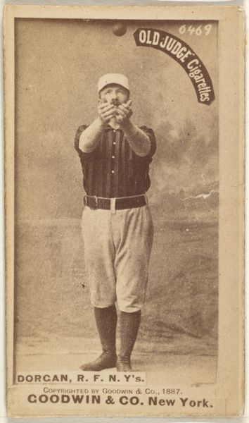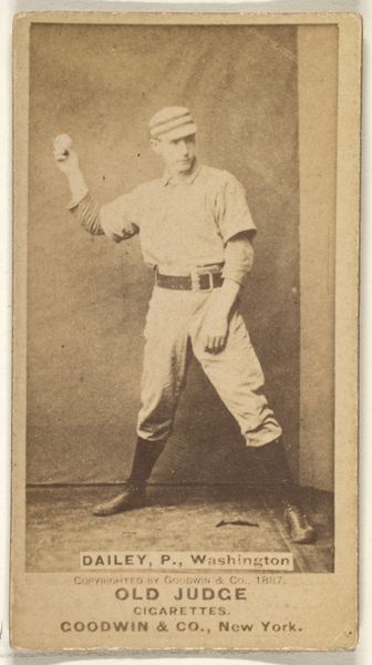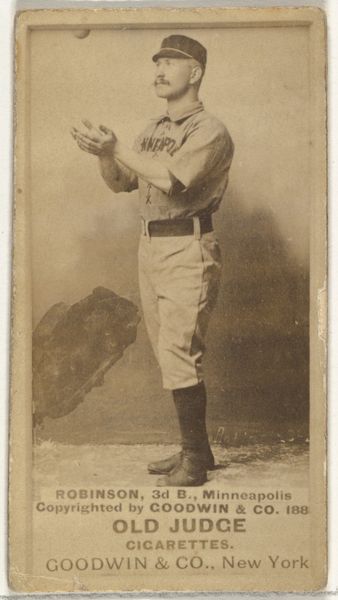 This late 19th-century card, produced by Goodwin & Company, features Alexander "Colonel" Ferson, a pitcher for the Washington Nationals. It’s made of paper, likely mass-produced using industrial printing techniques. These cards were originally inserted into Old Judge Cigarettes packs. The sepia-toned photograph is mounted on a card that would have been printed with the player's name, team, and the cigarette brand. Consider the context: a tobacco company using images of athletes to sell their product. This speaks volumes about the intertwining of advertising, consumer culture, and the burgeoning popularity of professional sports at the time. The card embodies this relationship directly. The mass production of such cards reflects the rise of industrial capitalism. These cards were designed for widespread consumption, turning baseball players into commodities, which links the world of sports with industry and labor. By looking closely at the object and its making, we can move beyond the image itself and consider its place within broader economic and social structures.