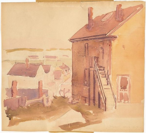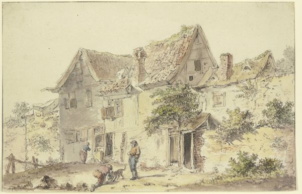 Paul Huet made this watercolor painting, Boerderij te Guibray, using washes of brown, grey and pale blue to capture a rustic farm scene. Note how the loose brushstrokes and muted colors evoke a sense of quiet and transience. Huet's composition emphasizes the architectural form of the farmhouse. The structure dominates the visual field, presenting a study in contrasts: light against shadow, solid walls against open doorways. This interplay is not merely descriptive; it suggests a deeper interest in the dialectical relationship between presence and absence, visibility and concealment. Consider how Huet uses light to create a sense of depth, with the darker tones defining the interior spaces and shadowed areas. This technique invites us to reflect on the artwork's capacity to both reveal and obscure. Through this formal arrangement, Huet transcends a simple representation of rural life. The painting becomes a meditation on the nature of perception, inviting viewers to question what is seen and what remains unseen.