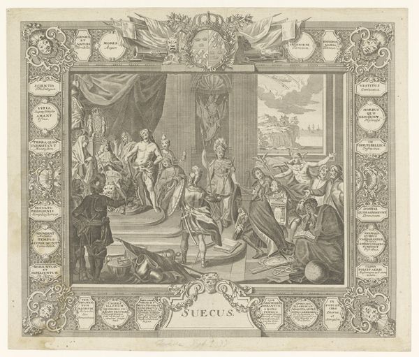 Editor: This engraving, titled "Dapperheid van koning Pepijn de Korte, ca. 751-768" by Jean-Louis Delignon, appears to date from sometime between 1765 and 1804. I'm immediately struck by how it depicts what seems like an arranged spectacle—a bull and a lion pitted against each other, with King Pepin seemingly intervening. What do you see when you look at the image? Curator: As a materialist, I'm most interested in the printmaking process itself. Think about the labor involved in creating this intricate scene. Each line, each shadow, was carefully etched into a metal plate. How does that hand-made quality contrast with the grand spectacle it portrays? Editor: I suppose it's like the printmaking process mimics the deliberate arrangement of power in the arena, the king’s display of controlled force? Curator: Precisely. Consider the social context: prints like these circulated widely, making narratives of power accessible to a broader audience. What does it mean to reproduce and distribute images of rulers enacting dominance through staged events? Editor: So, it’s not just about glorifying King Pepin's courage, but also about controlling how that image, and the idea of his kingship, is consumed? The very act of creating and distributing this print is a form of asserting authority? Curator: Absolutely. It's about manufacturing and disseminating an image of power through labor and materials, a tangible manifestation of ideology. The lines of the engraving themselves become lines of power, directing the viewer’s gaze. What does that labor suggest to you about social hierarchies during the 18th century, when it was created? Editor: Thinking about it that way, it brings the focus back to the engraver and their role in shaping perceptions, it adds another dimension to interpreting the work. Curator: Indeed. It is always useful to analyze these elements to comprehend how power and ideology materialize into the everyday.