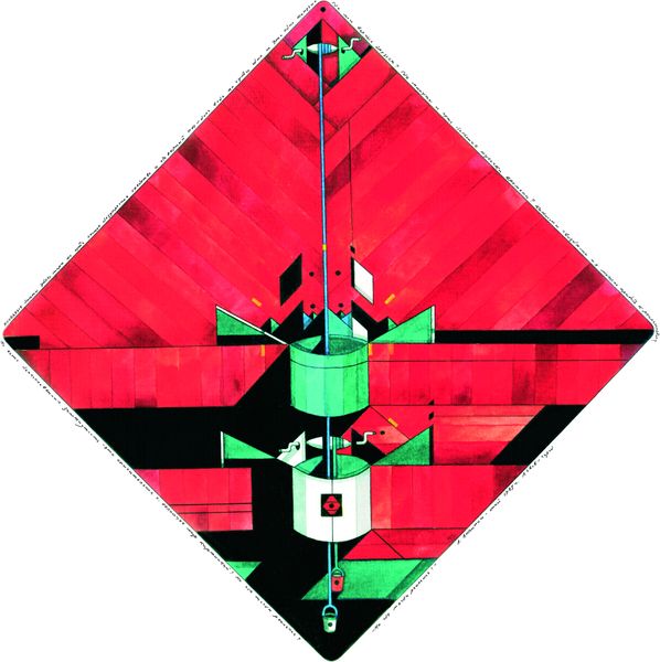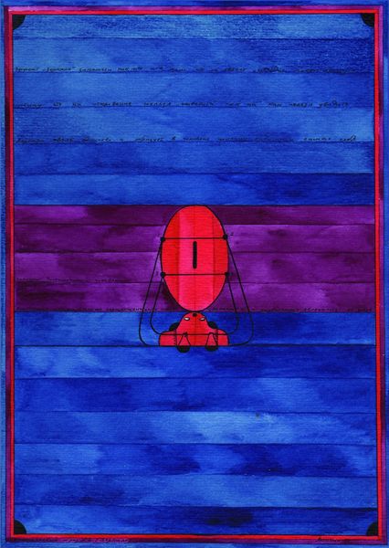 Oleksandr Aksinin made this image using what looks like watercolor and ink. It reminds me of those old instruction manuals, you know, the kind with exploded diagrams and mysterious symbols. The green background is laid down in these watery horizontal bands. It’s almost like looking through Venetian blinds. Then, these carefully rendered red shapes appear, like surreal fruit or, well, something else entirely. The ink lines are so precise, giving it this otherworldly technical feel. But then, there's this undeniable sense of humor! I keep coming back to that cone-shaped head with its little red legs sticking out. It’s both absurd and kind of beautiful. It reminds me a little of Hilma af Klint, but Aksinin is quirkier, more down to earth. Ultimately, I think Aksinin invites us to embrace uncertainty. It’s a world of visual puzzles and personal symbolism that keeps you guessing.