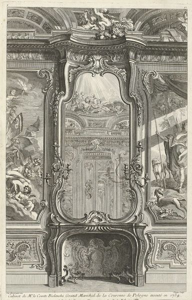 This is a black ink print by an anonymous artist, showcasing a design for a mantelpiece with a candlestick and eagle, now held in the Rijksmuseum. The design features a complex, symmetrical composition, rich with ornamentation that suggests a moment of transition in styles. Observe the dense, rhythmic interplay of lines and textures. The eye is drawn to the central void of the fireplace, around which the ornamental details swirl. The candlestick and eagle are not just decorative; they introduce a semiotic layering. Eagles, traditionally symbols of power and vision, are juxtaposed with the domesticity of a candlestick, creating a tension between public display and private contemplation. The print destabilizes the distinction between art and design. Is it a blueprint, an artwork, or both? This ambiguity reflects the period’s shifting ideas about the role of art in everyday life and the dissolution of clear boundaries between artistic disciplines. This piece invites us to reconsider how design elements function not merely as aesthetic choices but as carriers of cultural meaning.