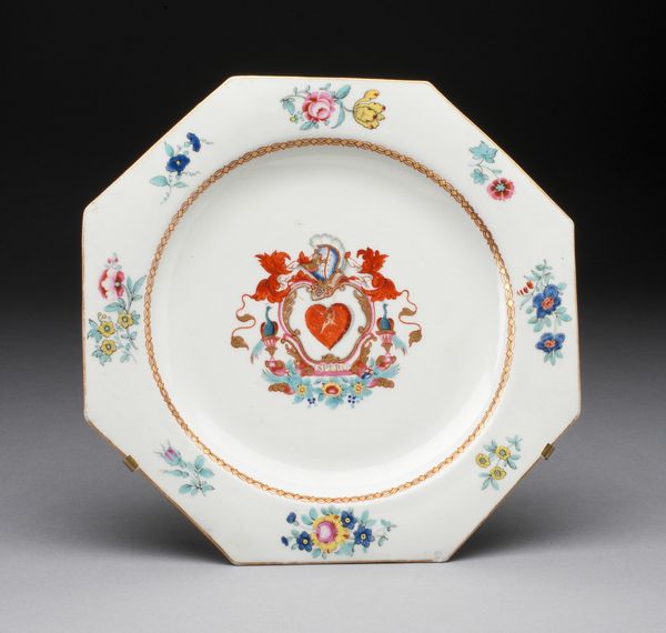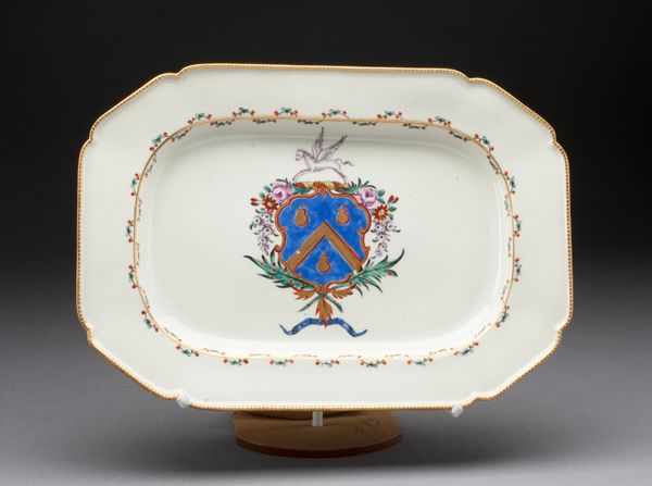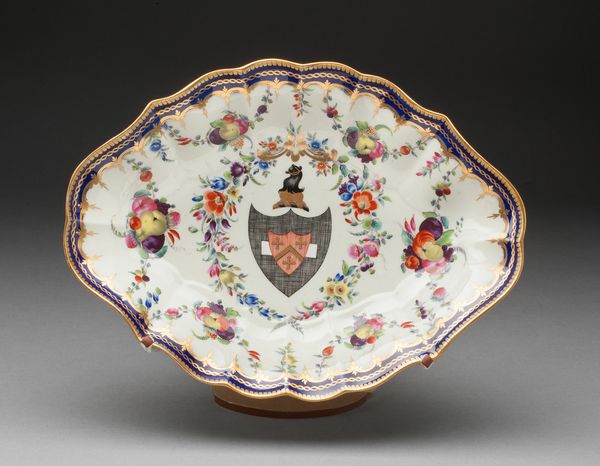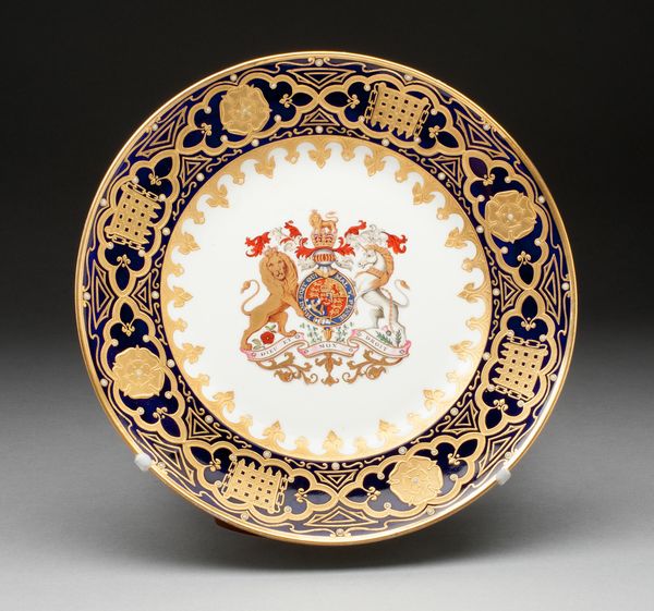 The Worcester Royal Porcelain Company crafted this decorative plate, part of the Duke of Clarence Service, demonstrating both utility and heraldic expression. Observe the plate's structure; concentric rings of ornamentation surround a central crest. Ribbons intertwine with floral motifs around the rim, crafting a playful yet controlled rhythm, while a delicate gold band separates this outer vivacity from the heraldic emblem at the center, grounding the piece in formality. The plate's aesthetic plays with semiotic systems of power and beauty. The crest, with its colours and symbols, speaks to lineage and authority, while the surrounding decorative elements offer a softer counterpoint, hinting at the pleasures and refinements associated with courtly life. The formal arrangement suggests a controlled dialogue between the spectacle of power and the allure of beauty. Note how the plate presents a microcosm of societal structure: a blend of hierarchy and decoration, inviting viewers to decode its visual language and reflect on the cultural values it embodies. The plate remains open to ongoing interpretation, its structure offering a glimpse into the complexities of its time.