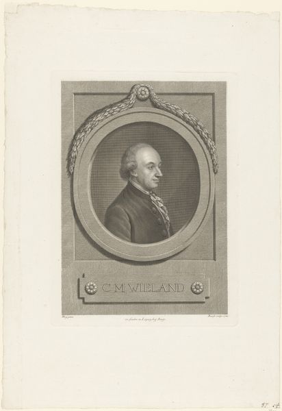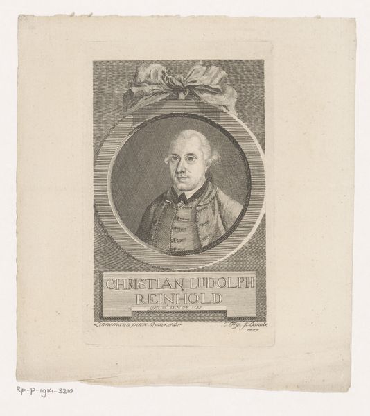 Curator: Before us, we have a portrait etched in 1797 by Gerhard Ludwig Lahde, titled "Portret van Christoph Georg Ludwig Meister". Editor: Its mood is quite contemplative; the composition’s tight focus really draws you into the subject’s gaze, or rather, his profile. The artist captured an introspective, intellectual spirit using very minimal tonality. Curator: Indeed. The oval frame within the rectangular border emphasizes the classical elements, doesn’t it? Note the controlled strokes defining the subject’s features – his nose, the set of his jaw. Lahde’s expertise manifests in this precise application of line and shading. Editor: The man, identified below as C.G.L. Meister, appears very austere. His simple collar suggests religious or academic affiliation; perhaps it’s an attempt to signal something specific about his status or moral qualities. The plain clothing, a rejection of frivolity. Curator: Precisely. These elements serve a clear communicative purpose beyond mere representation. Also, examine the stippling effect Lahde achieves in the background of the oval. See how the density and variation creates depth behind Meister. It’s quite refined! Editor: These portraits were often commissioned by or for scholarly circles, weren’t they? Sort of a visual "who’s who" of the enlightened elite. The image and text worked together to reinforce specific cultural values within these networks, projecting qualities of learning and status. Curator: Absolutely. It is like a form of social validation but rendered as art object. Also observe how the tight border further accentuates his commanding profile. I'm curious about Lahde's decisions about that particular composition. Editor: And perhaps that strong, unwavering gaze represents more than individual will—possibly a broader commitment to duty and higher ideals, depending on who the audience was. These engravings could be about setting symbolic precedents, solidifying identities within Enlightenment ideals. Curator: A very valid consideration. It demonstrates how visual form embodies cultural ideology. Editor: I'll certainly never see such understated images the same way. Thank you for showing me the compositional integrity and value it contains! Curator: My pleasure; the subtle beauty reveals a rigorous intellectual foundation when considered intently.