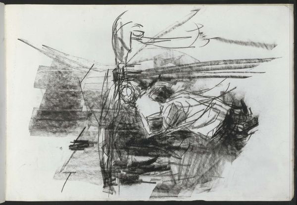 Curator: We're looking at "Interior," a 1963 print and drawing by John Henry Rock. The work presents an interior scene containing a nude figure. What are your initial thoughts? Editor: It feels immediately vulnerable. The muted tones and blurred lines create a sense of unease, as though we're intruding on a private, possibly painful, moment. Curator: I agree. It's vital to consider the time this was created. In the early 1960s, depictions of the nude female form were fraught with societal expectations and objectification. How do you see this work fitting, or perhaps disrupting, that historical context? Editor: Rock seems less interested in idealized beauty, and more invested in exploring the physical experience of being in a body, perhaps in conflict. Look at the texture – the roughness of the print, combined with the charcoal lines. Curator: Yes, he skillfully combined the precision of printmaking with the gestural freedom of drawing. It brings a rawness to the piece. He appears focused on capturing the materiality of the form rather than sanitizing it. What implications might the "Interior" have in terms of spatial awareness, particularly within the broader discourse of gendered spaces during this period? Editor: Well, domestic spaces, were obviously heavily gendered during this time period, and the reclining nude, traditionally a symbol of leisure and ownership, here becomes… trapped, perhaps. The obscured forms around her suggest barriers, both physical and emotional. There is an air of constraint here. Curator: Precisely. The material process emphasizes the tension inherent in the female body, perceived not just as aesthetic object, but existing within patriarchal and artistic traditions. We need to analyze it within those confines to understand the complexity of its presentation. Editor: I agree. Thinking about the choices the artist made—the layered media, the specific color palette—opens up many avenues for exploration regarding social narratives of the time, not only of women in that society but domestic work in the house or even mental wellbeing of domestic settings during the time this art work was produced. Curator: Absolutely. It really demonstrates the complex relationship between representation, materiality, and societal power structures. It provides layers of commentary. Editor: It certainly leaves you with plenty to consider.