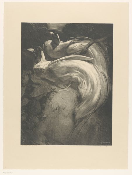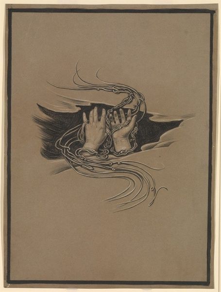 Curator: Paul Gauguin’s etching and engraving, "Te Faruru (They are Making Love Here)," created between 1894 and 1895, offers a glimpse into his Tahitian-inspired visual language. Editor: It's striking—almost dreamlike in its ambiguity. The brown monochrome gives it an ethereal quality, and the figures seem to emerge from a primordial soup. The textures contrast sharply between fluid lines and areas of near solid colour. Curator: Absolutely. Gauguin was deeply interested in capturing what he perceived as the unspoiled, primal aspects of Tahitian life and incorporating their spiritual beliefs into his art. The title itself, “Te Faruru,” hints at an act of intimate connection. Given the composition and figures portrayed, however, it reads as something far more spiritual, and the choice to not use indigenous printmaking and carving techniques adds to this distinction. Editor: Looking closer at the composition, the placement of figures seems significant. They don't engage with the viewer directly, drawing our attention to the linear qualities defining the figures and objects. The dense texture of the figures compared to the almost solid mass surrounding them gives them an otherworldly aura. Curator: Remember that Gauguin was part of a Post-Impressionist movement pushing against the purely representational art—Gauguin was focused on expressing inner visions and a type of collective, perhaps subconscious memory. You can clearly see elements of Tahitian symbology influencing the rendering of form here. Editor: But is this simply Gauguin's construction of Tahiti filtered through a European lens? The way he simplified and abstracted the human forms is an interesting dialogue between the cultures being explored. It seems more of a projection of fantasies onto an exoticised “other,” rather than any authentic representation. Curator: It's undeniable that Gauguin approached Tahitian culture as an outsider. The "erotic art" theme, as it's sometimes labeled, speaks to a very specific Western gaze. But that tension is exactly what makes his work so compelling. He's wrestling with genuine emotion and flawed perception simultaneously. The work leaves us grappling with complex cultural dynamics. Editor: A compelling thought, framing this in an intercultural discourse definitely challenges our aesthetic reaction and offers a new framework for reading these exotic themes, as perceived by Gauguin.