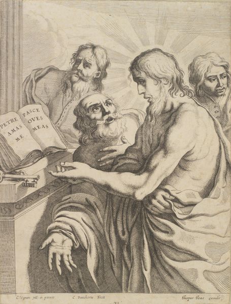 Carlo Faucci created this print, "Saint Matthew," in the 18th century, employing engraving. The composition balances light and shadow to evoke a mood of contemplative intensity. The figure of Saint Matthew, positioned with a book, anchors the visual weight on the right, while a secondary figure provides a contrasting presence to the left. Faucci’s use of line is particularly striking. Observe how the density and direction of engraved lines define form and texture, creating a dynamic interplay across the surface. This technique not only models the figures but also contributes to the overall narrative tension. Considering this work through a structuralist lens, the act of writing and the presence of the book can be interpreted as signs within a larger system of religious iconography. The print destabilizes a clear interpretation; it invites viewers to consider the layered meanings embedded within the artwork's formal structure.