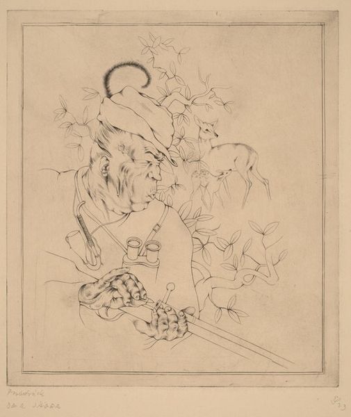 Editor: This is "Révérence," a print, an etching in fact, created by Carl Larsson in 1896. The pale yellow and the figure bowing downward gives it an antique feel. What social commentary is captured in such a simple image? Curator: This work offers a glimpse into the socio-political climate of the late 19th century, a period marked by rigid social hierarchies and prescribed gender roles. Larsson, celebrated for his depictions of domestic bliss, here presents a formal gesture – a bow – loaded with implications. Who is she bowing to, and what power dynamic does that represent? Editor: Perhaps the etching process itself speaks to these themes? It's so precise. Curator: Absolutely. The etching process, requiring meticulous preparation and controlled execution, mirrors the strict codes of conduct governing social interactions at the time. Furthermore, prints are inherently reproducible. Could Larsson be commenting on the widespread dissemination of ideals regarding proper behaviour, particularly for women? Consider the role of popular imagery in reinforcing social expectations. Editor: I see. The choice of a print, compared to painting, could represent a democratisation, even though what is depicted are not democratic ideas. What do you make of the large yellow dress and dark bows? Curator: The voluminous dress, fashionable at the time, serves as a visual marker of status, but it's the downward gaze that truly captures my attention. Does it denote deference, submission, or perhaps even a calculated performance of social expectations? Are the dark bows a symbol of mourning? The image evokes questions rather than providing answers, thereby sparking dialogue, and allowing viewers like ourselves to interpret the message within a social framework. Editor: Thank you for contextualizing it that way. I initially just saw a pretty image, but seeing the work in relation to social structures opens it up a great deal. Curator: Indeed, appreciating art within its historical and cultural context allows us to engage with its complex layers of meaning and its enduring relevance to our own world.