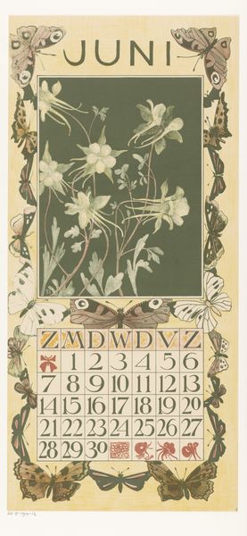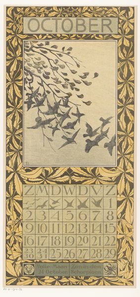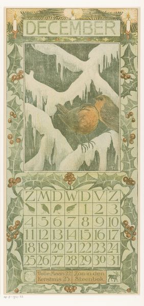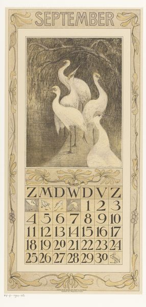 Theo van Hoytema created this print, *Kalenderblad mei met twee pauwen*, for a calendar, employing lithography and striking color choices. Van Hoytema, working at the turn of the century, found himself amidst a time of shifting perspectives, eager to embrace new means of expression. In this piece, two white peacocks are rendered in a stylistic manner, surrounded by an Art Nouveau frame. The calendar blends functionality with aesthetic beauty. Peacocks at this time were often used as symbols of pride and beauty, and the choice to portray them in white may suggest themes of purity, luxury, or even a critique of conventional notions of beauty. The piece invites reflection on the ways in which nature, art, and daily life intertwine. There is a quietness to the work, a still moment that perhaps reflects the artist's personal quest for harmony and balance in a rapidly changing world.