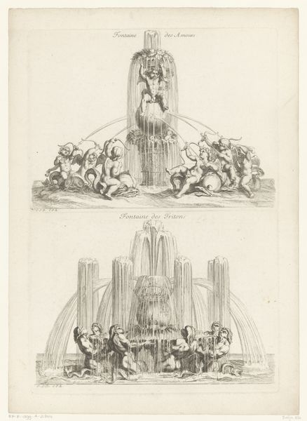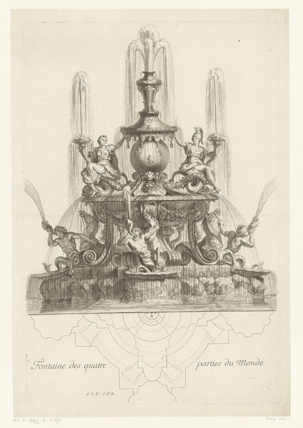 Curator: Before us we have a drawing, an engraving really, titled "Fountain with tripod of Apollo" dating back to between 1672 and 1686. The piece is attributed to Louis de Châtillon. Editor: It's quite striking, really. The monumentality leaps out. But also the stark contrast between detailed engraving and... are those preliminary architectural plans sketched below? Curator: Yes, that contrast is quite crucial. Look how de Châtillon establishes the form, pushing and pulling our attention between ideal and practical design. The rigorous lines map out the foundational geometry that gives way to the exuberance of the fountain above. Editor: The symbolic weight feels meticulously planned as well. The nymphs with their floral offerings seem to beckon some sort of idyllic offering. What's that resting figure to the side represent? Curator: Given the title's reference to Apollo, the resting figures may evoke artistic inspiration or divine reverie. And notice, it is positioned opposite the figure who holds flowers, which indicates fertility and growth, perhaps tying it to seasonal themes as well. Editor: I'm also drawn to the contrast between the smooth curves of the cascading water versus the defined lines of the sculptures. Do you think this could symbolize a blending between nature and divine intervention? Curator: Absolutely. Baroque art often aimed for such dynamic synthesis. De Châtillon uses the linear structure to showcase precisely where nature yields to Apollonian order, and the cultural significance associated with him. It speaks of an aspiration for harmony between rational structure and symbolic significance. Editor: It's thought-provoking how much history and artistic intention can be packed into an engraving. Thank you, it changed my perspective on seeing it. Curator: My pleasure. A close look at form can certainly reveal so much cultural information.
