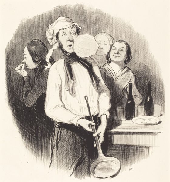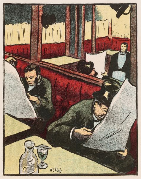 Editor: This is Jack Davis's "Playboy Cartoon" from 1957, made with mixed media including ink and drawing. It definitely has a humorous vibe to it. I’m struck by the contrast between the two men depicted. What stands out to you? Curator: What I notice immediately is the orchestration of line and form. Consider the exaggerated features, bordering on caricature, against the relatively straightforward backdrop. Note how Davis manipulates perspective; the customer appears flattened, almost compressed, whereas the wig salesman boasts depth, accentuated by the shadows. The contrast directs our attention to their differing roles and perhaps hints at the superficiality of their interaction. Editor: So you are focusing on how the piece directs us through visual cues. Curator: Precisely. Even the palette guides us: somber browns and grays versus the splashes of red and highlights around the vendor’s face, pushing him forward as the focal point. Have you observed the placement of the wigs themselves? Editor: You mean on what looks like wine glasses? It’s… unexpected. They’re arranged almost like specimens. Curator: An apt comparison! Notice the rhythmic repetition, creating a visual cadence disrupted only by the chaotic texture of the held wig. This breaks the controlled structure, injecting dynamism and heightening the comedic impact. Do you find any sense of semiotic closure, or lingering visual tension? Editor: The image makes me reflect on how humor can arise from such close observation of structure, but I think there's still plenty to learn! Curator: Agreed. Focusing on artistic elements deepens understanding and appreciation, far beyond subject matter.