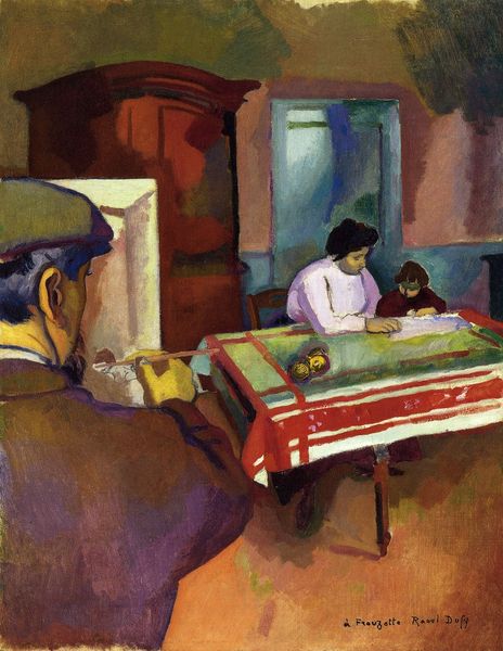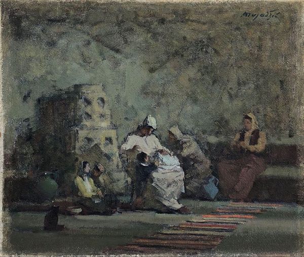 Curator: This is George Pemba's 1952 oil on canvas, "The Prodigal Son." Editor: My immediate reaction is one of familial tension and suppressed emotion. There’s a claustrophobic feeling intensified by the tight composition, although light from the window is focused on the central figure who's doing the talking. Curator: It's insightful to consider that tension within its social climate. Pemba, a Black artist working in apartheid South Africa, used genre paintings to explore narratives of identity and social injustice, representing ordinary people within domestic spaces. Editor: Yes, knowing that Pemba lived and worked under apartheid deepens my reading. It’s interesting to see the role of faith that must have been critical during times of repression, to view the young man from an intersectional lens— class, race, age, gender… it all feels like its bubbling under the surface of this strained exchange. Curator: Absolutely. We can analyze how "prodigal son" narratives resonate through the dynamics of patriarchy, religious morality, and racial identity during the apartheid era, particularly as Pemba uses flattened perspectives, interior settings, and figures of emotive strength in ordinary situations to reflect South Africa’s lived reality for Black families. This piece almost presents a direct intersection between private morality, societal expectation, and familial obligation in a single captured moment. Editor: Looking at this today, "The Prodigal Son" raises significant questions about redemption and reconciliation – ideas central to faith and the struggle for civil rights worldwide, don't you think? This piece seems to want a space to consider historical and cultural significance within religious art traditions but to challenge these too. Curator: That is to say, what emerges here is the historical context combined with personal story–making for an extremely moving observation on human drama. It's precisely those threads—history and humanity—that weave the potent complexities in Pemba's paintings. Editor: And leave us wrestling still, across time and space.