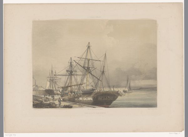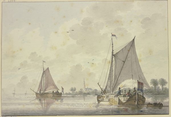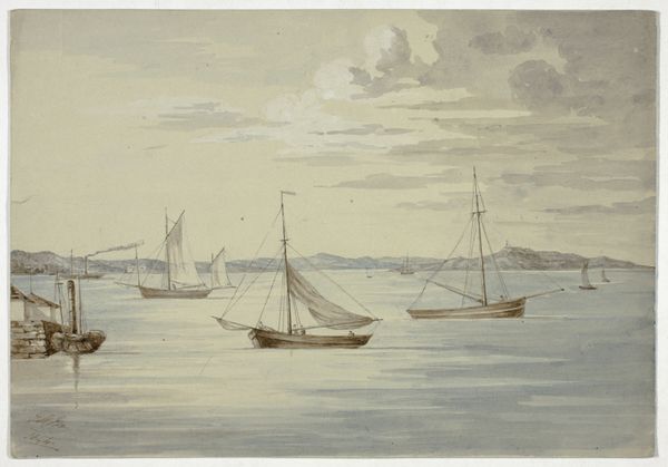Editor: So, here we have "Zeilschepen in een haven," or "Sailboats in a Harbor," a watercolor made sometime between 1829 and 1879 by Ary Pleijsier, currently housed here at the Rijksmuseum. It's very soft and calming; the blues and greys sort of melt into one another. What do you see in it? Curator: Well, besides a lovely collection of bobbing boats, I see a snapshot of a bustling maritime world caught in a moment of serene reflection. Notice how the masts create a forest of verticals, mirrored imperfectly in the water below. It's like the artist is whispering, "even in the busiest ports, beauty finds a way to sneak in." Do you get that sense? Editor: Definitely! It's not as... romantic as I was expecting. It's like it shows a working harbor more than a picturesque scene. Curator: Exactly! And Pleijsier is using this wonderfully fluid medium, watercolour, to evoke a feeling as much as document a place. You see that lone figure on the right? It makes you wonder, doesn’t it, about his story? What is he observing, dreaming, pondering? Or am I just projecting? Editor: Maybe a little! But that's what's great about art, right? It invites projection. And the date range... almost half a century. Is there something to the timeframe, perhaps? Curator: Intriguing, isn’t it? Suggests a style that wasn't chasing fleeting trends, but capturing a timeless quality of life, eh? It also tells us that some art cannot be easily defined nor easily categorized, even despite our compulsion to box everything into time frames! Editor: Right. Well, I didn’t think about the reflection having a larger implication; now the way you mention that single figure really makes me pause... Curator: I feel exactly the same; a harbor scene turned pensive portal! Wonderful.