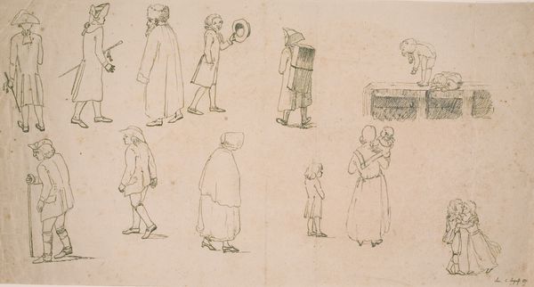 Curator: Let’s turn our attention to this intriguing page from Josephus Augustus Knip’s sketchbook: "Studieblad met Italiaanse boeren en boerinnen," or "Study Sheet with Italian Peasants," dating from between 1787 and 1847. Editor: My immediate impression is one of poised observation. These aren’t posed figures, exactly, but captured studies, a quiet dignity amidst the rural life the artist is charting. There’s a delicate formality in the line work, almost as if Knip approached the page with both reverence and a keen interest in detail. Curator: Knip was indeed known for his meticulous observation. His works are so fascinating due to the inclusion of very precise and varied details. The sheet reveals a series of figures, both male and female, adorned in traditional Italian clothing, complete with studies of the back views and headwear, providing an almost encyclopedic survey of local attire. I find them so symbolic. Editor: Absolutely! This act of recording itself places a certain emphasis on the subjects. The decision to capture these figures signifies the way even seemingly commonplace cultures are important and worthy of preservation, wouldn't you say? Especially when considered alongside other depictions of labor, which often exclude women in such clear positions. Curator: Most certainly. Consider the recurring motif of headwear. Hats are so meaningful within social constructs: They shield, protect, distinguish social class, signal regional affiliation… We even see details like the way hair is carefully bound or dressed. The clothing is almost an index of the wearer’s place in society, a set of signals communicating to others. Editor: Yes, and perhaps signaling something about Knip’s position too. A Dutch artist sketching Italians; there’s a tension there in the representation of “the other,” so to speak. A question arises as to whose gaze is prioritized: does he capture or appropriate a culture? Curator: The Romantic interest in local customs and "folk" is definitely at play here, though the distance suggests it is academic art and not some idealized nostalgia for simple living. Even now, such cultural signifiers hold weight. Think about the re-emergence of indigenous patterns or the politicization of dress. Knip’s drawings become not just visual records but seeds of meaning. Editor: Looking closer, these sketches push me to consider clothing design itself. The choice of one shape or silhouette versus another, the fabrics employed, it makes you think. Curator: In its seemingly straightforward recording of Italian rural clothing, this study sheet echoes with meanings, with silent statements about tradition, class, identity, the gaze of the artist, and the symbolic nature of clothing and attire. Editor: Right, this detailed work pushes you to re-examine our daily environment through the lens of culture. It brings history into conversation with our current lives.