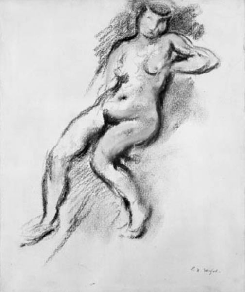 Editor: This pencil drawing, "Siddende kvindelig model, set bagfra," which translates to "Seated Female Model, Seen From Behind," was created by Aristide Maillol between 1898 and 1901. I find it so intriguing how such simple lines can capture the weight and form of the human body. What stands out to you about this piece? Curator: What’s striking is how Maillol participates in, and yet subtly resists, academic traditions around the nude. The seated, rear-view pose invites the male gaze, but it’s rendered in such a way that softens and even questions the dynamics of objectification that underpinned much art of this period. Editor: How so? Curator: Consider the drawing's softness, and its medium: humble pencil on paper. The scale is intimate, and the subject is less an idealized goddess, more a figure of everyday life. It marks a shift, doesn't it, away from the grand Salon nudes toward a more modern, perhaps even democratic, representation of the body? How does that democratization read to you? Editor: That's a really interesting point. The informality of the medium, the everyday pose… it does feel like a conscious choice to move away from the classical, idealized forms. Curator: Precisely. Maillol’s work, including this drawing, embodies a transitional moment, reflecting changing social attitudes towards the body and art's role in representing it. He offers not just an image, but a commentary on the public and political dimensions of art-making itself. Editor: I'm definitely seeing this drawing in a new light now. The art of its time and our understanding of its culture. Thank you! Curator: Indeed, the drawing allows a powerful opportunity to discuss representation and social change.