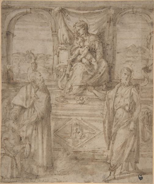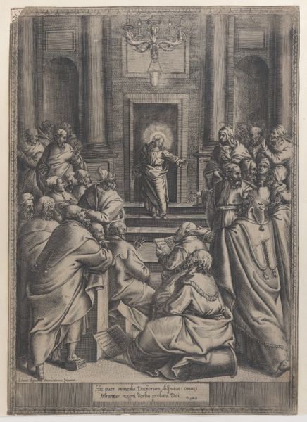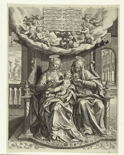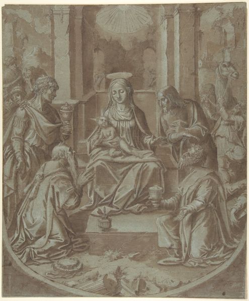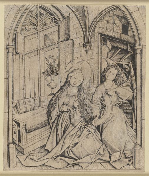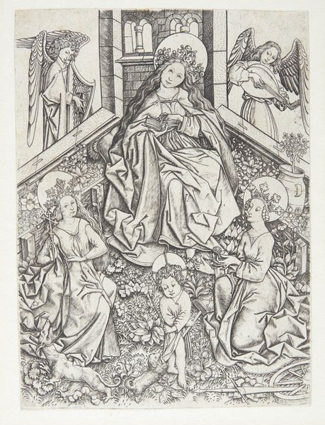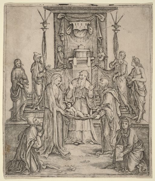 Editor: Right, let’s talk about Israhel van Meckenem’s "The Holy Family with St. Anne," a print rendered in ink on toned paper, dating from 1435 to 1503. The sheer level of detail in the line work is kind of astonishing, but there's a stiffness to the figures, don't you think? What do you see when you look at it? Curator: A fascinating dance between the earthly and the divine! The engraving feels almost dreamlike. The texture, built from tiny strokes, gives it such depth. Can you almost feel the quiet awe emanating from the scene, despite the, as you say, the relative "stiffness"? Perhaps we could think of that rigidity as reverance? What do you suppose Meckenem intended through that contrast, floating somewhere between worldly reality and transcendent idea? Editor: Reverence… interesting. I hadn’t considered it quite like that, but I see what you mean. Is it common to see such everyday-looking people in such divine imagery? Curator: Ah, good question. Notice how the faces, while possessing individuality, are also quite generalized? In his own day, Meckenem was one of the first artists to create, not portraits of celebrities, but accessible archetypes, and also among the first to actually sign all his works. He wasn’t simply interested in likeness but in distilling essences, maybe hoping others could make it their own…almost like a popular reproduction? Editor: So, in a way, he was making the divine more relatable through, as you say, approachable everyday folks? And he also had an eye on legacy…I get it now. Curator: Precisely! Maybe art is not a painting, a song, a movie…but something, in this case ink on paper, pointing us back to something else altogether. Editor: Huh. A reproduction *of* accessibility *for* reverence. Curator: Yes, you may be on to something big... perhaps a papercut from another, earlier wound of living, now become beautiful again.