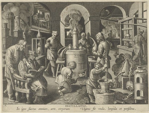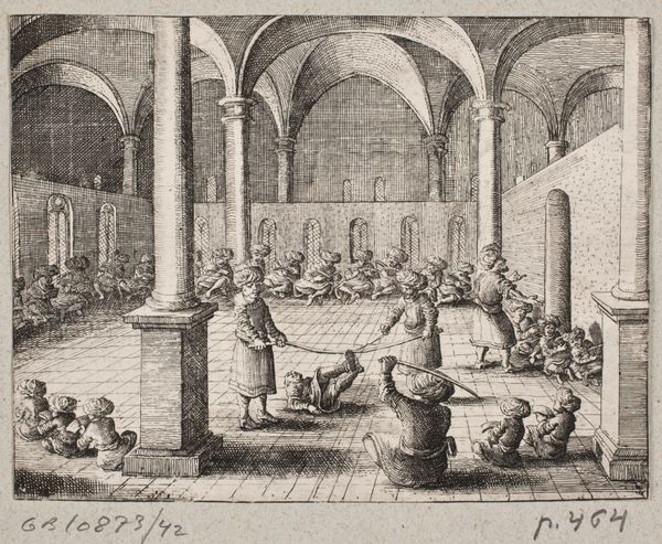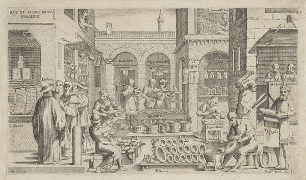 Editor: This etching, "A Market" by Francesco Curti from 1603, teems with life, but I wonder about the placement of the figures and goods; what can you tell us about the historical context of marketplace imagery at this time? Curator: The bustling market scene wasn't merely a reflection of daily life; it was a carefully constructed representation of the social order. Notice the hierarchy in placement and how each trade is visually distinguished. This highlights the social strata and economic activities that were considered important to portray. Editor: So, Curti wasn't just showing us a market; he was showing us a social structure? Curator: Precisely. The market was a stage for performing social roles, and Curti’s image reflects that performance, reinforcing the established order through visual representation. Consider how the guilds shaped not only the goods sold but also the very image of commerce itself. Editor: It’s fascinating to think about how much these images were about conveying power structures as much as the goods. Curator: Indeed. It makes you consider what other 'everyday' scenes might be conveying about the politics of imagery at the time.