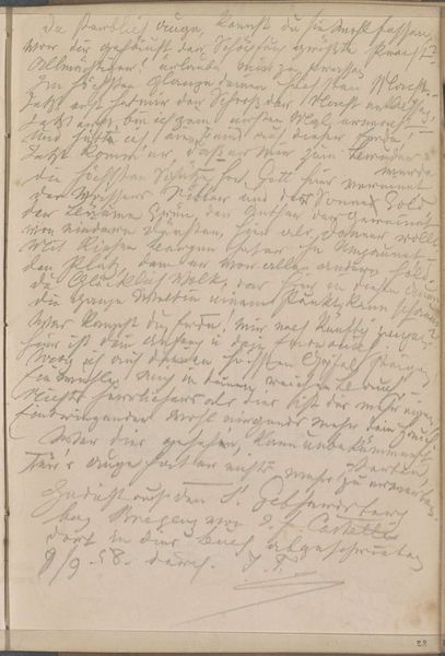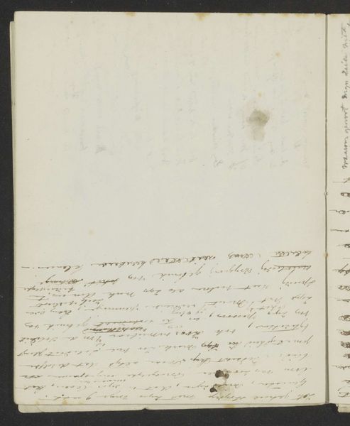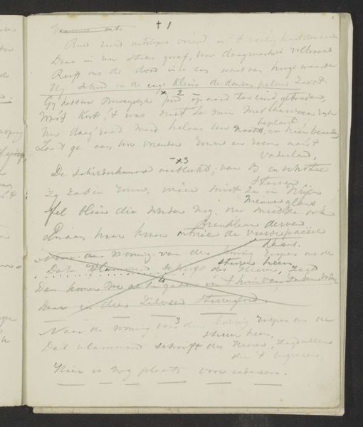This sketchbook page of ‘Notities, deels doorgehaald’ by Maria Vos presents a striking contrast between the orderly script at the top and the chaotic scribbles at the bottom. The page invites you to decode its layers and the visual elements that communicate on different levels. The neatly written text gives way to a field of abstract marks, an exercise in pure form. These lines challenge the legibility of the upper part of the composition. The ordered text above, adhering to the conventions of language, suggests structure and meaning. In contrast, the bold and disruptive lines below seem to reject these notions. The linear network and overwriting gestures introduce a dynamic tension, destabilizing traditional ideas of art as a representation. Vos's work exists within a complex network of signs, codes, and contexts, constantly re-evaluating its formal qualities, mirroring the evolving cultural landscape in which meaning is continuously reshaped.