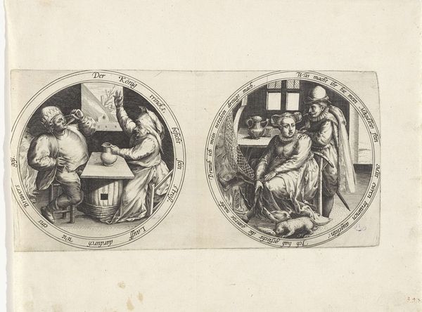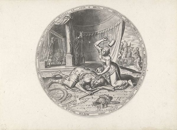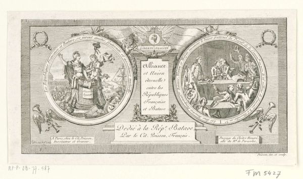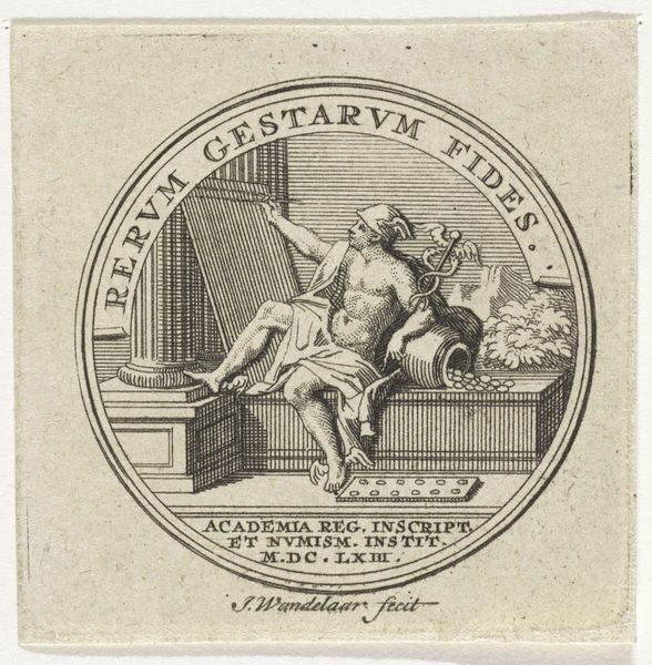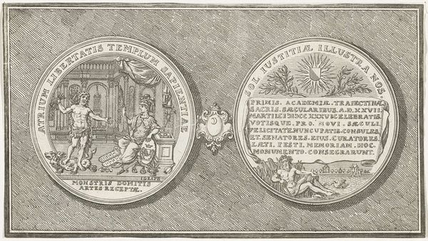 Curator: This piece, housed here at the Rijksmuseum, is a commemorative medal crafted in 1736 by François van Bleyswijck. It's titled "Penning op het eeuwfeest van de Utrechtse Hogeschool, 1736," celebrating the centennial of Utrecht University. Editor: My first thought is the intense allegorical language. It’s quite baroque; a drama is unfolding even in this small circular format. Curator: Precisely! The medal is divided into two scenes, each laden with symbolism relevant to the university and its values. One side depicts the "Atrium Libertatis," or courtyard of liberty, suggesting a haven for free thought. Editor: That courtyard imagery is immediately striking. We see a figure taming beasts, signifying the arts conquering savagery and ignorance. And Athena herself presides, a protector of that space. It reminds me of discussions about safe spaces versus free speech within academia today. How power is protected. Curator: It also ties into the historical narrative of universities as places for civilizing and moral improvement, something profoundly embedded in institutional purpose and justification from that era. Editor: Yes, a purpose which, even now, must be examined. Let's consider that inscription, "Monstris Domitis Artes Resipiunt." With monsters tamed, the arts flourish. This reveals the assumption of a binary—arts versus base instincts—a simplification worth challenging. Curator: A challenge relevant to the time of its creation as well. This medal acted as institutional promotion, it's meant to affirm that perceived purpose and virtue for benefactors, visitors, or prospective professors and students. The opposite side proclaims “Sol Iustitiae Illustra Nos,” begging for enlightenment through law. Editor: Look closer. We see the river god pointing at the inscription, at that petition to be enlightened through law. His location next to the university anniversary dedication begs us to contemplate if the university's goal to shine justice to the public really plays out that way. Curator: It encourages critical examination of an institution's past promises as they're aligned to power. Bleyswijck's choices encourage these sorts of dialogue around what a University should stand for. Editor: Absolutely. Even this small engraving provokes thinking about larger questions about higher education, enlightenment ideals, and their relationship to society. Curator: Indeed. I appreciate how analyzing this medal can open up pathways to thinking about enduring cultural ideals, still alive, well, and ever evolving in modern academic environments.
