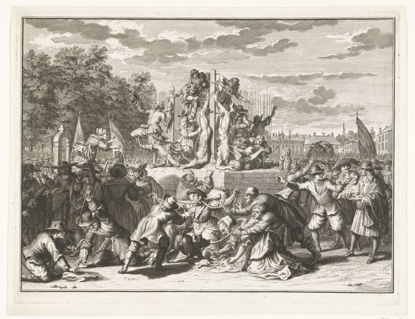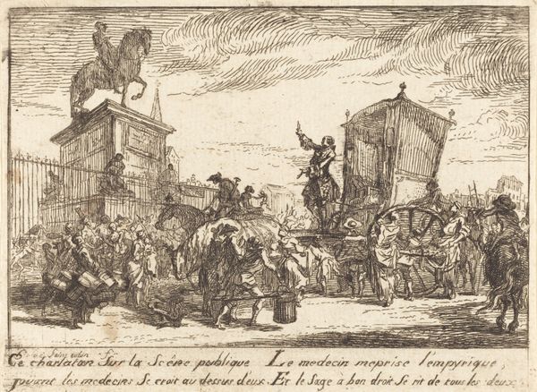 Editor: This is "Joseph Distributing Grain in Egypt," a print made by Jan de Bisschop sometime between 1638 and 1671, currently housed at the Rijksmuseum. There is such incredible detail for what seems to be a rather mass-produced object. What aspects of the printmaking process stand out to you? Curator: This work reveals much about the commodification of religious narratives in the 17th century. Note how the engraving technique, likely etching here, allows for relatively quick reproduction. Consider the economics – how many prints like this needed to be sold to make it a worthwhile enterprise? Editor: That’s fascinating. I hadn’t considered the market forces at play. How do the materials influence our understanding of the artwork? Curator: Absolutely. The accessibility of printmaking materials, the paper and the ink, alongside the artist's skill allowed religious narratives to be disseminated amongst a wider audience. It democratizes, in a way, the visual consumption of power and the Church. Look closely, and consider the social ramifications. Who would have purchased this print and why? Editor: Would this be seen as "high art"? The engraving appears quite detailed, yet the ability to reproduce it diminishes its singularity… Curator: That’s the central tension! Does its reproducible nature undermine its artistic value? Or does it democratize art production and accessibility? Think of it within its historical moment: what are the competing forces acting on notions of artistic value, considering patronage, craft, and the growing merchant class? The print medium really embodies this. Editor: So by examining the print itself, the paper, the ink, and the social context, we can better understand its impact… it opens up a whole new avenue for interpreting art! Thanks for the insight. Curator: Exactly! Always consider the physical creation and social impact – it unlocks a wealth of understanding beyond the image itself.