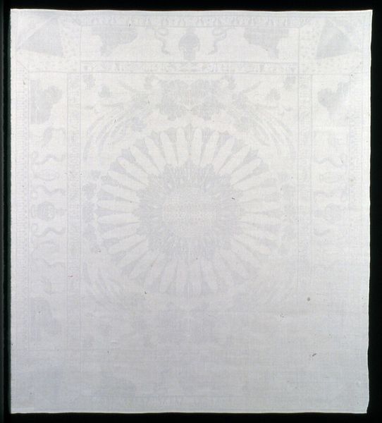 Editor: Here we have a linen napkin dating back to around 1689-1699, titled "Servet met Londen en Willem III, koning van Engeland", or "Napkin with London and William III, King of England". It's anonymous, so we don't know who designed and wove it. It's all in white, very subtle, very elegant. What do you make of it? Curator: Well, immediately, I think, what a statement piece for a dinner party! Imagine serving your guests with something so richly symbolic. This isn't just a napkin; it's a piece of political theatre, wouldn't you say? Consider William III, strategically placed on horseback, almost mythic, framed by those glorious cityscapes and heraldic shields... It's all so very deliberate. Does the imagery perhaps strike you as unusual, perhaps contradictory? Editor: A little, yes. What contradictions do you see? Curator: Note that 'Vivat Hispaniarum Rex' slogan… 'Long live the King of Spain' but here represented on a textile to honor William the Third? Almost ironic, right? I bet this textile told many tales through the ages. Editor: So, you’re saying this napkin's all about shifting alliances and power plays? That's incredible. To think something so everyday could be so loaded with meaning! Curator: Absolutely. Everyday objects are often the most powerful communicators. Do you wonder how someone might react if such an ornate woven tableau was casually used to wipe up a smudge of gravy at table? What is ‘disrespect’ versus ‘utility’, eh? Editor: That does put a new spin on things. It's made me realise how much more there is to decorative art than meets the eye. Curator: And to realize, truly, that art thrives when context blossoms from detail!