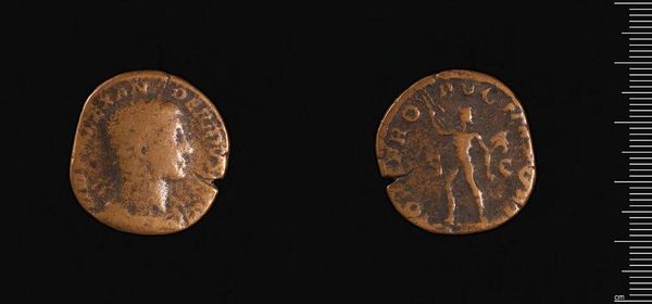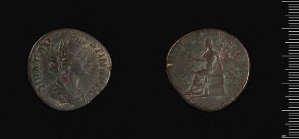 Editor: Here we have a Sestertius, a coin featuring Faustina I, housed at the Harvard Art Museums. The patinated bronze gives it a sense of age and history. What can you tell me about the formal qualities of this piece? Curator: The coin presents a fascinating study in relief sculpture. Observe how the artist uses incised lines and subtle gradations to define form within a very limited space. The circular format also dictates the composition. How do you think the artist's choices impact the viewing experience? Editor: It's interesting how the circular format focuses the attention. I hadn’t thought about how challenging that would be for the artist. Curator: Precisely. And notice the condition of the object itself. The wear flattens certain details, yet also enhances the overall texture, creating a dynamic between representation and abstraction. Editor: This really deepens my understanding of the coin as a carefully considered object, not just a historical artifact. Curator: Indeed. Considering form and materiality opens up new avenues for interpretation.
