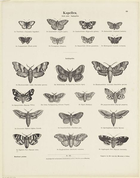 Ernst Fröhlich created this print, titled 'Kapellen / Eerste plaat. Dagkapellen', which translates to Butterflies, first plate, day butterflies. This lithograph presents a range of butterfly specimens, each meticulously detailed with their corresponding names. Consider this image in relation to the rise of scientific illustration and taxonomy in the 19th century. In the Netherlands, as in many parts of Europe, there was a growing fascination with natural history. Institutions such as the Royal Zoological Society played a role in promoting the study and classification of the natural world. These detailed depictions reflect a culture of observation, classification, and the desire to understand the natural order. Moreover, the print's creation and distribution would have been influenced by economic structures and social class, as access to education and scientific resources were often limited. To truly understand this artwork, we must consider the social and institutional context in which it was made. Scientific publications, museum collections, and the interests of patrons and collectors shape the creation, dissemination, and reception of art.