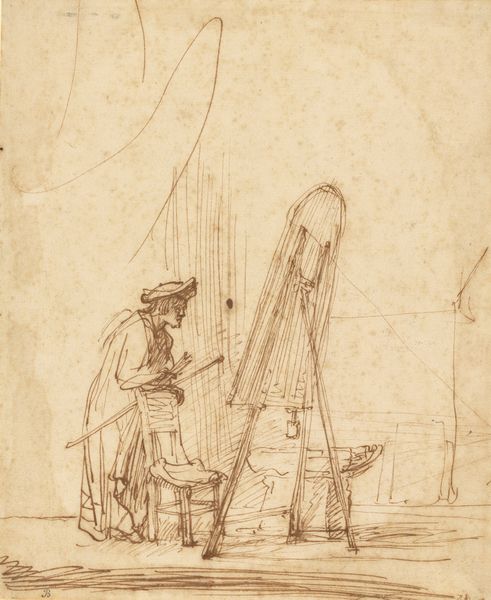 This drawing by Giovanni Boldini captures the painter Helleu at a café, a setting brimming with cultural significance. The café, more than a mere place for refreshment, symbolizes a space for intellectual and artistic exchange. The hat, casting a shadow over Helleu’s face, hints at the introspection and creative incubation occurring beneath its brim. One can't help but notice the similarity between the hat and the helmet. Throughout history, in images from antiquity to the Renaissance, the head covering is a mark of status, a symbol of thought, and here, perhaps, a barrier between the artist's inner world and the external chaos. The café, much like the ancient symposiums, becomes a stage for the drama of human intellect. The act of sitting, bent over papers, suggests a quiet absorption, a deep dive into the subconscious where images are born. Boldini captures a moment of intense, almost sacred concentration, reminding us that even the simplest setting can become a crucible for artistic creation. The image resonates across eras, a timeless portrayal of the artist's psyche at work.