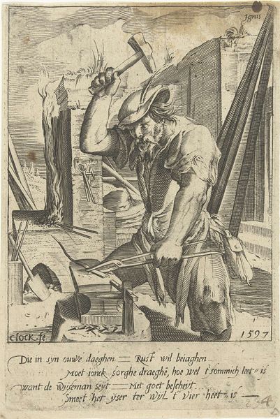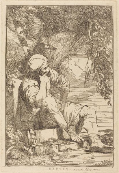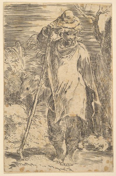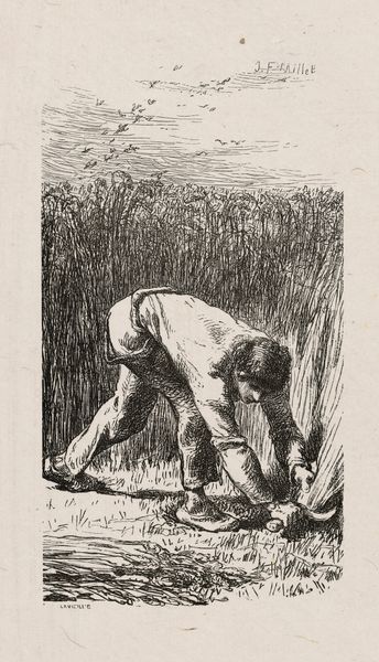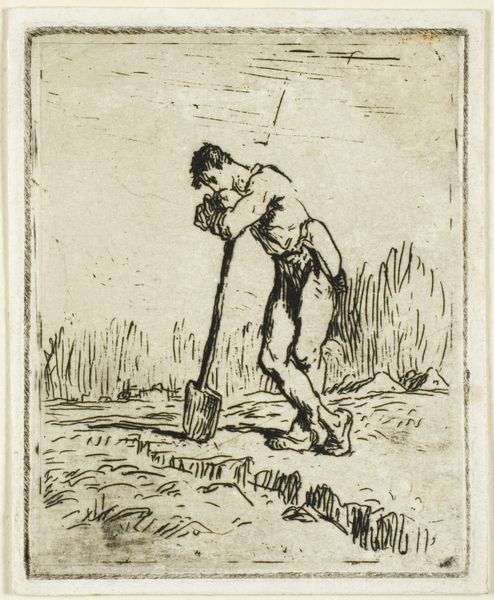 Curator: Let's discuss Alphonse Legros’s print, "Fagot-cutter," etched with a delicate yet powerful hand. What strikes you immediately? Editor: There's a palpable sense of weight and labor. The density of the lines almost feels oppressive, conveying the arduousness of the worker's task. Curator: Indeed, the figure, positioned almost centrally, is burdened by his toil. He embodies the enduring connection between humanity and the land, a trope echoed throughout art history. Look at how the artist used genre-painting themes within an Impressionist style to focus our attention. What cultural memory does it invoke for you? Editor: I think the subject gives primacy to manual labor, which had clear class connotations in the 19th century and perhaps even now, when there is a sense of "forgotten people" linked to working class identity in society, the media, and in politics. Curator: I find the composition striking in its simplicity; the large looming tree echoes his hunched figure and hints to our mortality through the cut logs next to his laboring body. Editor: Absolutely. There's a dialectic tension here between the ephemeral quality of line and the solid presence of figure and landscape. Curator: The figure appears again and again in the Realism of the period: the worker shown truthfully and plainly, with dignity and no patronizing attitude. His face is obscured beneath a wide brim hat suggesting a certain ambiguity: his humanity takes precedence over his individual character. Editor: Do you believe the absence of any narrative beyond the immediate task limits our reading? Or does it, perhaps, heighten the universality of his actions, turning it into more of a social allegory? Curator: Legros elevates a moment of peasant toil to something lasting and profound through the graphic skill and simple humanity of the scene. What is your final thought about the print? Editor: In the end, I am struck by its powerful use of graphic tools—how stark contrasts build a complex visual representation. The impression stays.
