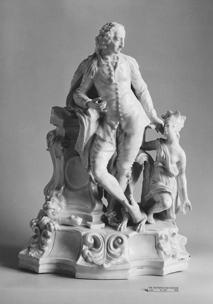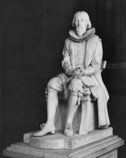 Curator: Standing before us is "Astronomer Tycho Brahe seated in a chair with a celestial globe next to him; beneath the chair lies a dog," a marble sculpture crafted by O. Evens in 1855, housed right here at the SMK. Editor: He looks so serious! Almost burdened by the weight of… what, celestial secrets? And that ruffled collar! I imagine it must have been quite itchy, like an idea you can't quite scratch. Curator: I find the details fascinating. Note the meticulous rendering of the garments and the almost casual inclusion of the dog. Marble is so unforgiving; the artist had to calculate every cut and angle. Labor is implied in every inch of the work, it seems. Editor: The dog certainly grounds him, doesn't it? It's as though Evens knew that even astronomers have mundane realities. And the way he's holding that globe, so deliberately. Is he figuring out the riddle of the universe, or is it more personal – perhaps contemplating his place in it? It’s a quiet kind of introspection rendered beautifully. Curator: I wonder about the source of the marble. Was it local? Was its extraction politically motivated or financially supported by the elite eager to represent themselves in art? This choice connects it all to economic and political systems of that era. The context shapes our very understanding of it. Editor: Ah, to know the origins! Still, its present effect on me is profound. It's not just a sculpture; it's a story frozen in stone, a moment suspended, and the expression frozen on the Brahe’s face just suggests many others he would be facing. Makes me want to write poetry! Curator: Indeed. And to analyze the sculpture's commission, the artist's payment, the display within the museum… It all informs our present viewing experience. Thank you. Editor: An absolute delight, finding so many layers to unpack.