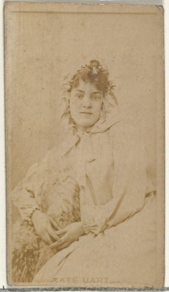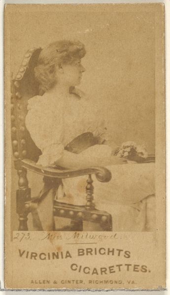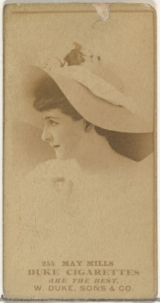 Editor: This is "Card 615, Miss Evans," part of the Actors and Actresses series produced between 1885 and 1891 by Allen & Ginter for Virginia Brights Cigarettes. It appears to be a photographic print, sepia-toned and rather petite. There's a delicate quality to the portrait; she seems lost in thought. What strikes you most when you look at this, like, material relic, you know? Curator: Well, besides immediately picturing a time when cigarette companies included art – and societal idols – *inside* their product packaging(!), I find the quiet intimacy remarkable. The subdued sepia tones soften the entire image. You mentioned her reflective mood; to me, that stillness, combined with the profile view, almost creates a cameo effect. I wonder, what kind of "brights" did Miss Evans favor, ha! It's all so captivatingly faded somehow. What do you think this format communicates about celebrity and consumerism at the time, compared to, say, Instagram today? Editor: That's fascinating! The cameo comparison is spot-on. It’s crazy to think of this as a form of advertising! Maybe the subtlety aimed to evoke a sense of sophistication… like, ‘smoke these cigarettes and become cultured?' A far cry from today's loud influencer culture! Did the company commission original photographs for these, or license existing ones, I wonder? Curator: Exactly! This pre-dates full-throttle modern advertising. I like that thought, yes, to ‘become cultured’. As to your question, often companies would acquire existing portraits, or hire photographers to produce images specifically for the cards. And seeing this as a 'relic', like you put it, really amplifies the sense of distance, doesn’t it? It almost feels like finding a pressed flower in a forgotten book. Editor: Definitely! It makes me think about how we preserve images and memories now versus then. Thank you, this was illuminating! Curator: Likewise! It is good to ruminate about beauty through the ages.